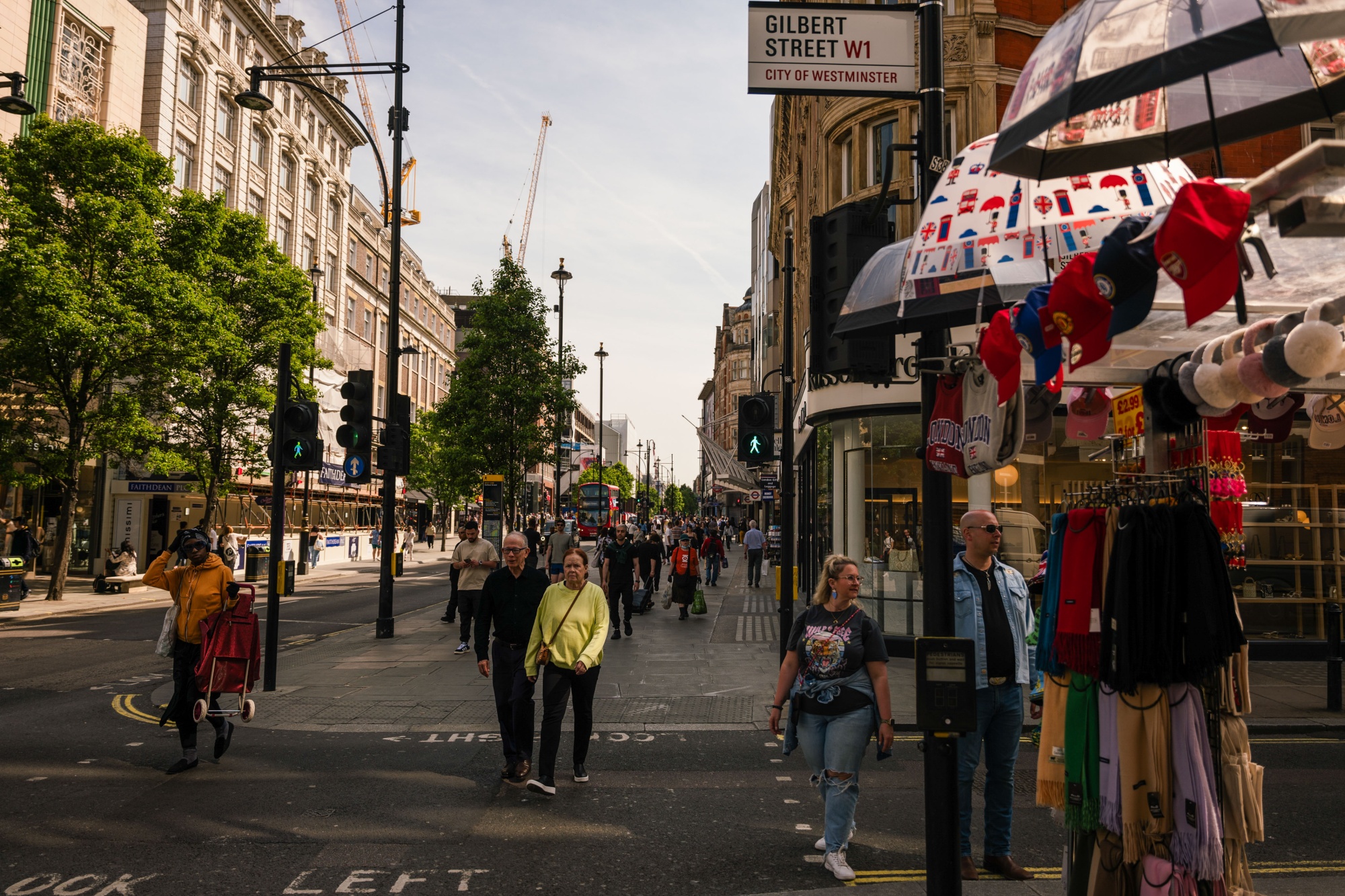 购物者于2024年5月10日星期五穿过英国伦敦中心的吉尔伯特街。