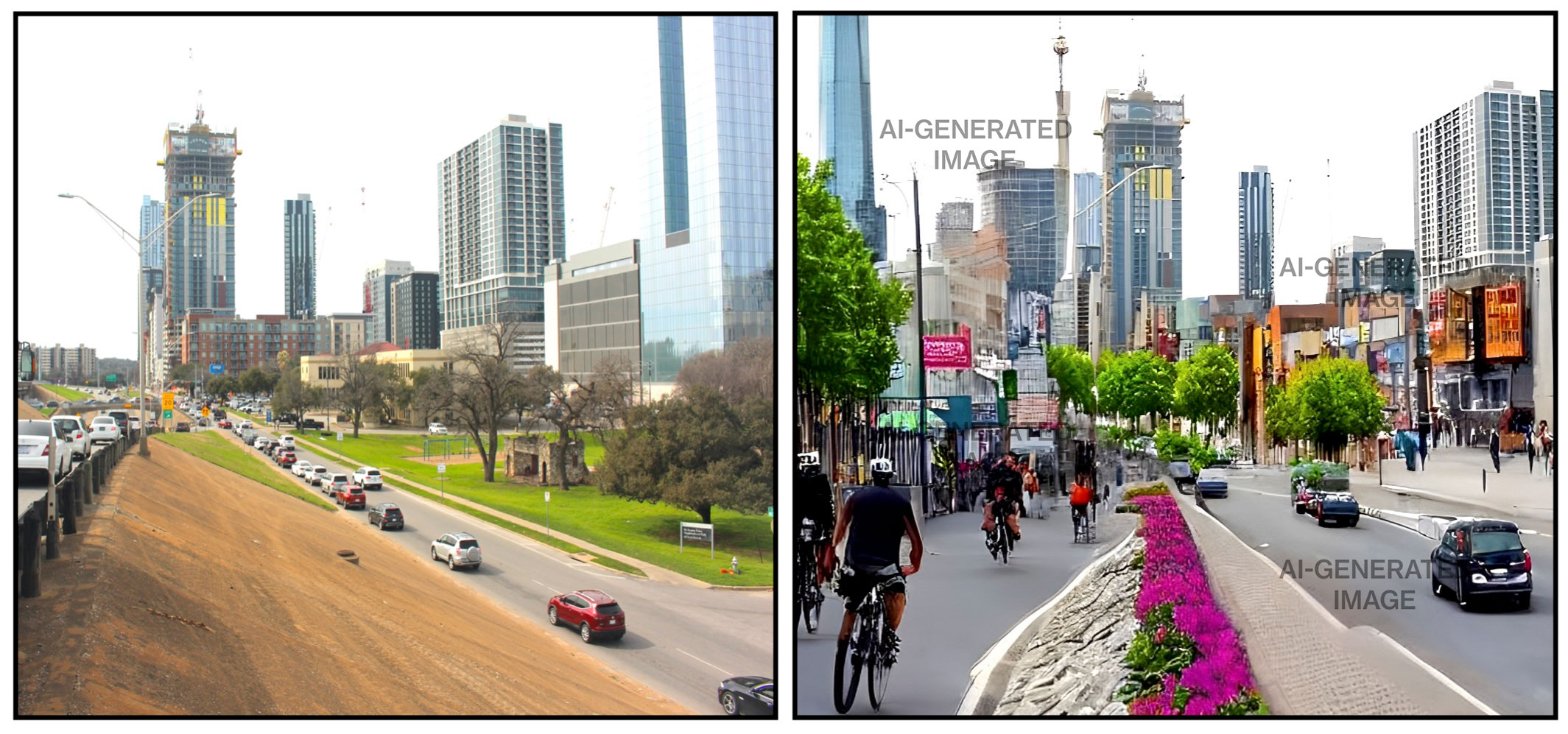 一幅人工智能渲染的图像,展示了奥斯丁可能成为行人和自行车友好的街道。