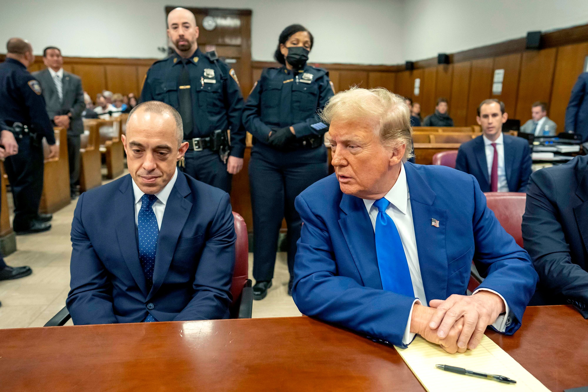 前美国总统唐纳德·特朗普(右)和前美国总统唐纳德·特朗普的律师埃米尔·博夫,2024年5月3日在纽约曼哈顿刑事法庭。