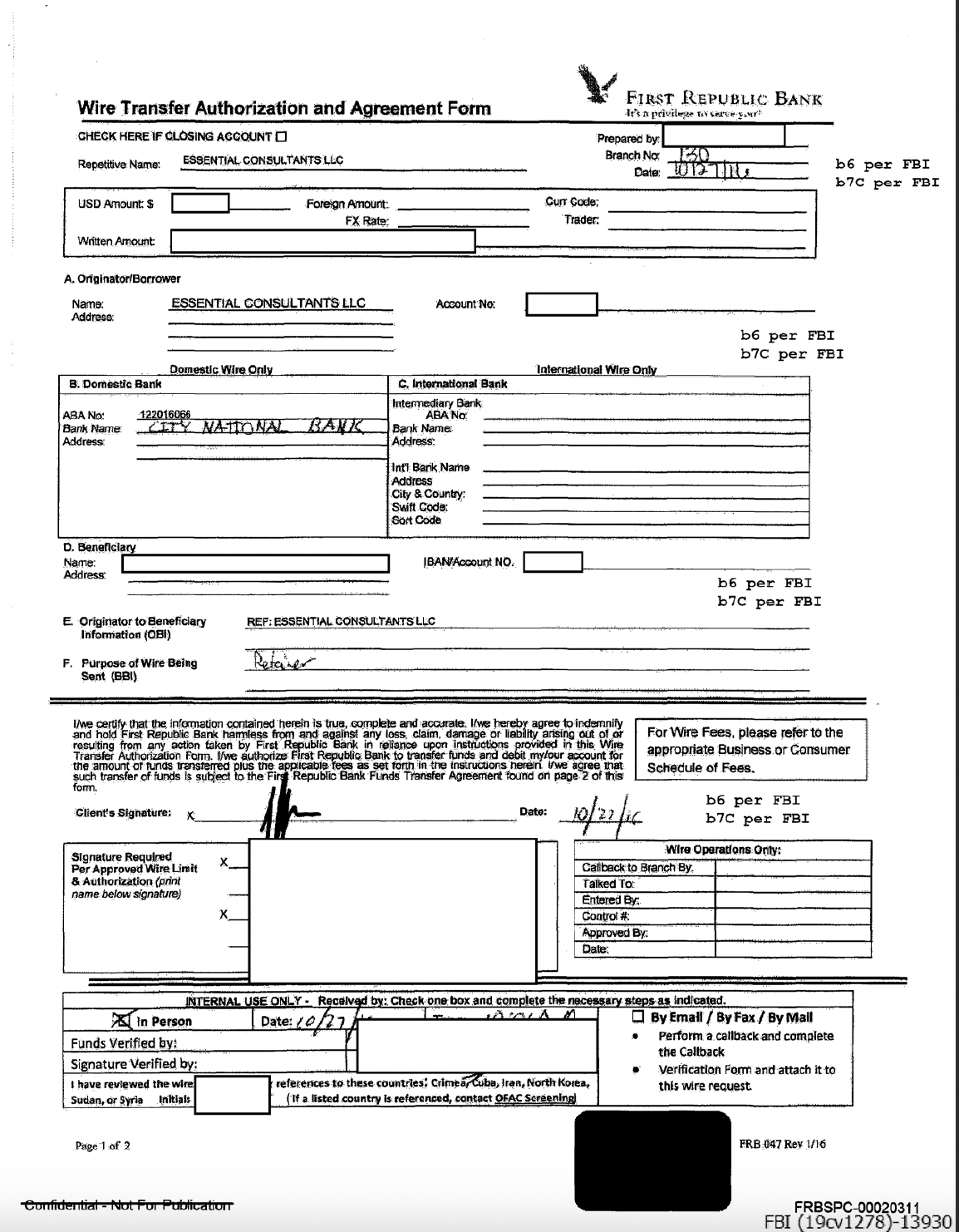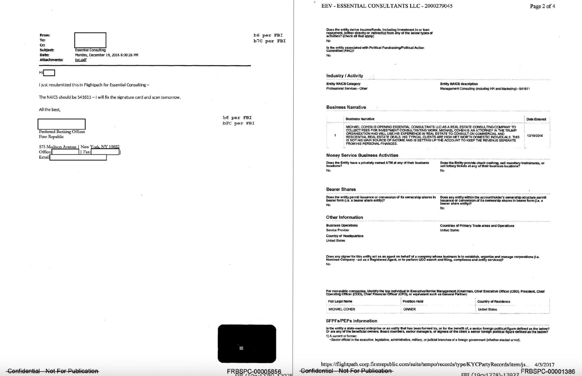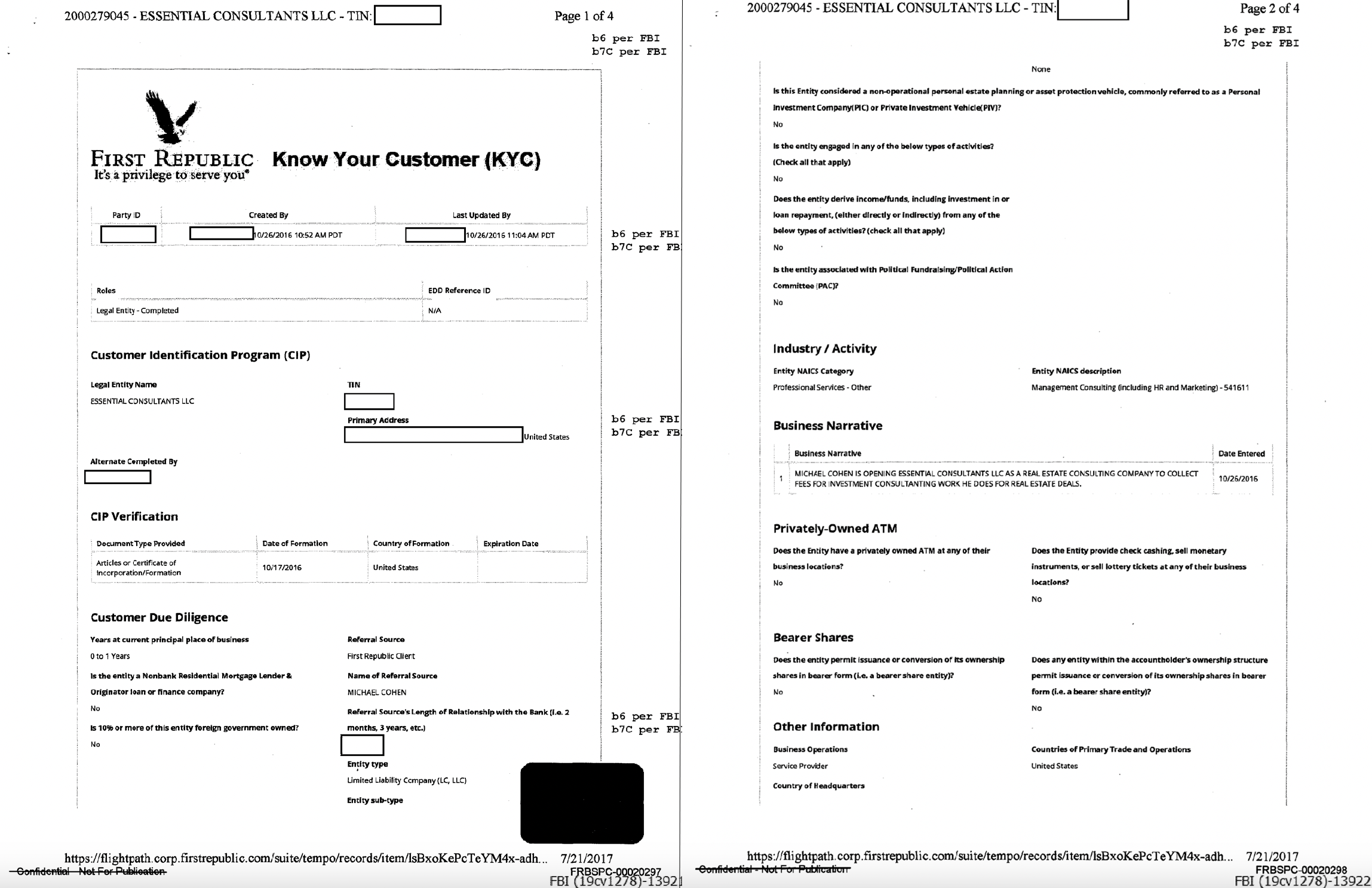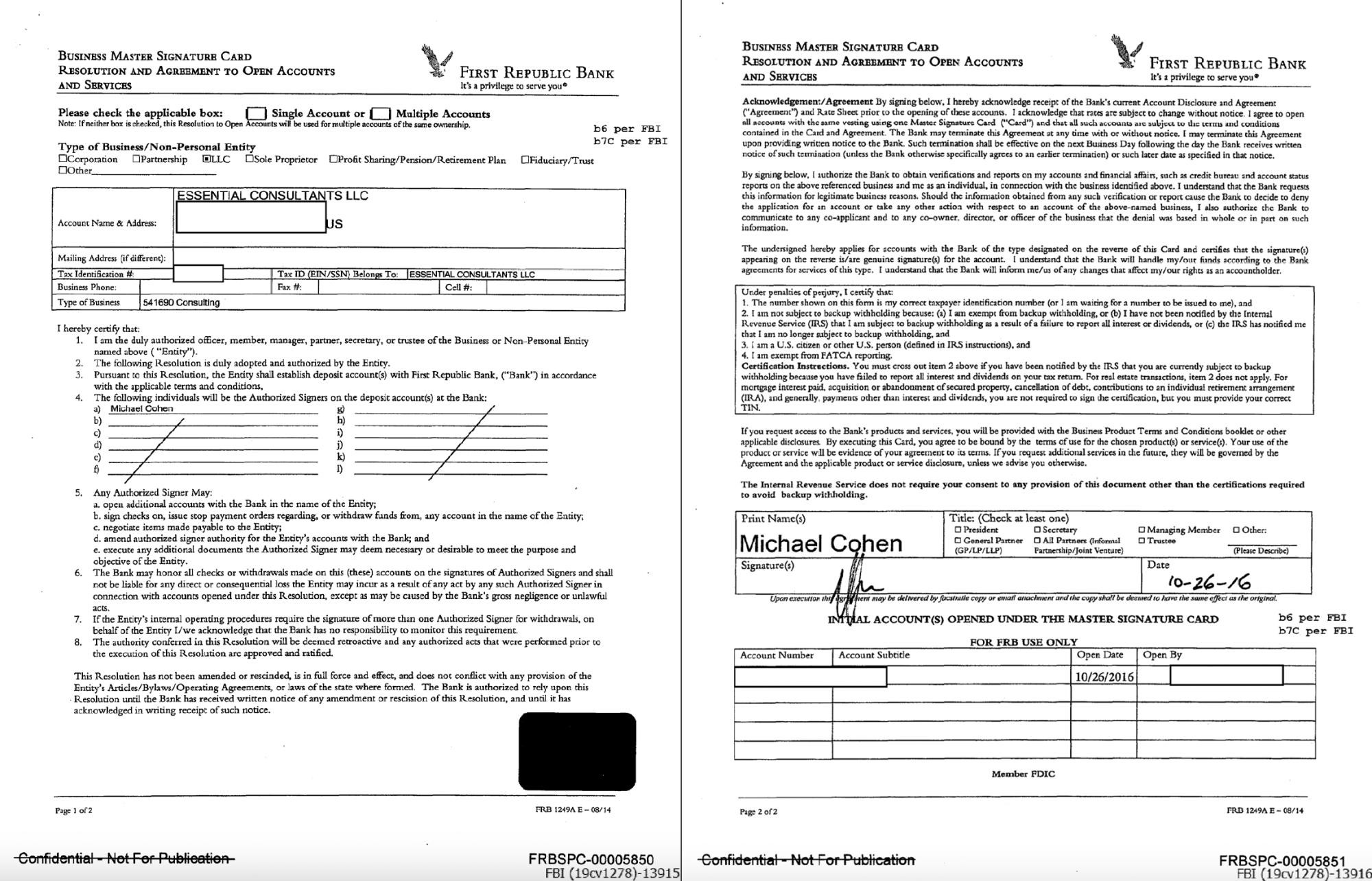 Essential Consultant的KYC表格,日期为2016年10月26日(根据时间戳,显然花费了第一共和国12分钟完成),表示科恩成立公司是为了“房地产咨询”和“收取他为房地产交易所做的投资咨询工作费用。”表格上的一个问题询问该实体是否“与政治筹款/政治行动委员会(PAC)有关。”答案是“否。”