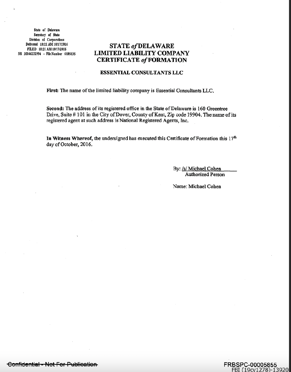 点击这里查看文件(第2-3页)](https://assets.bwbx.io/documents/users/iqjWHBFdfxIU/rZj84auXD3bU/v0)第三和第四份文件是成立证明,确认Essential Consultants在特拉华州成立为有限责任公司。日期为2016年10月17日,距离丹尼尔斯收到付款前10天,由科恩签署。