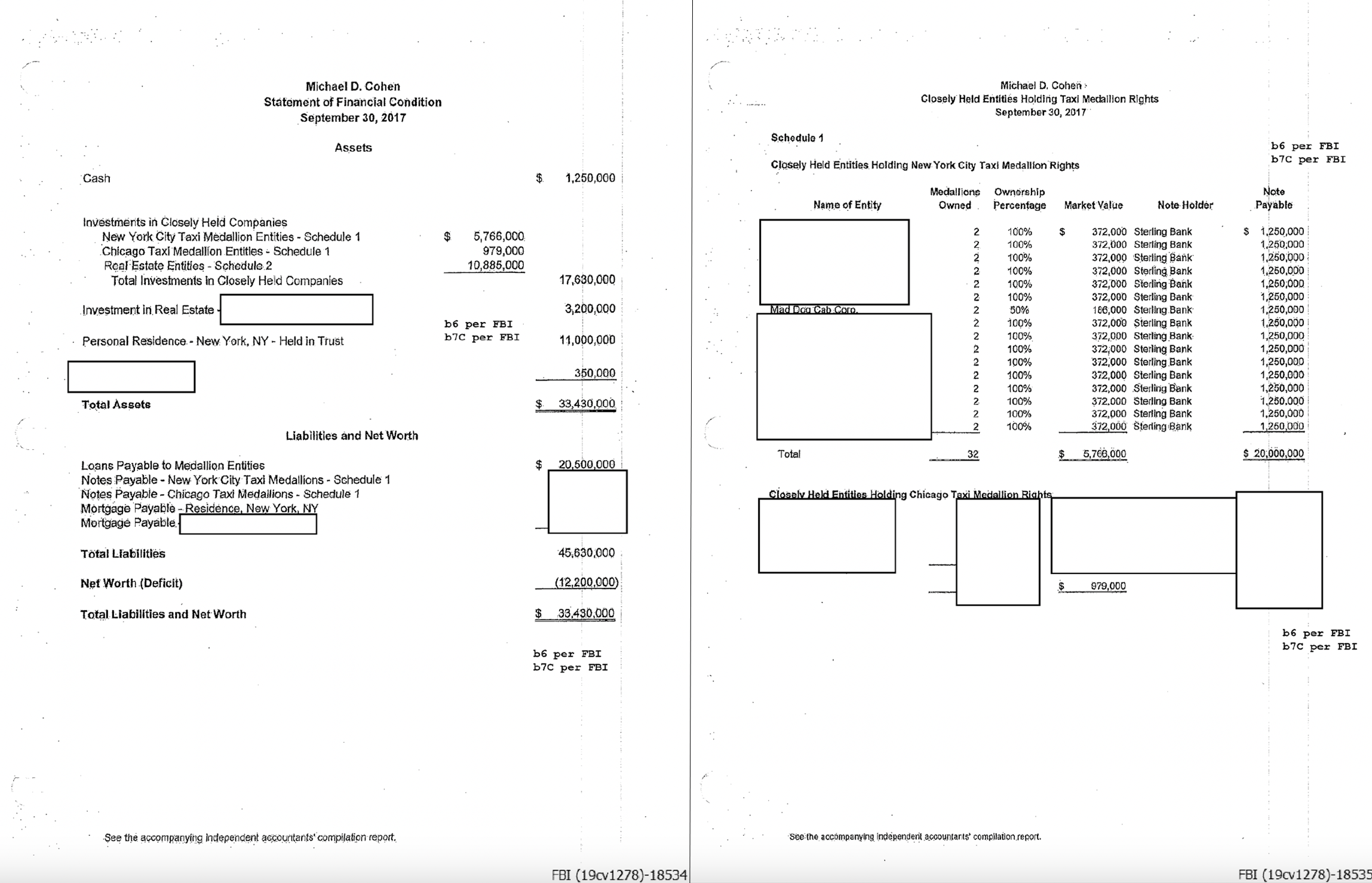 这些文件的日期为2017年9月30日,由科恩的会计师准备。它详细说明了科恩的商业和房地产资产的价值。它表示科恩的32个纽约市出租车牌照的市场价值接近580万美元,而芝加哥牌照的价值为979,000美元**。**