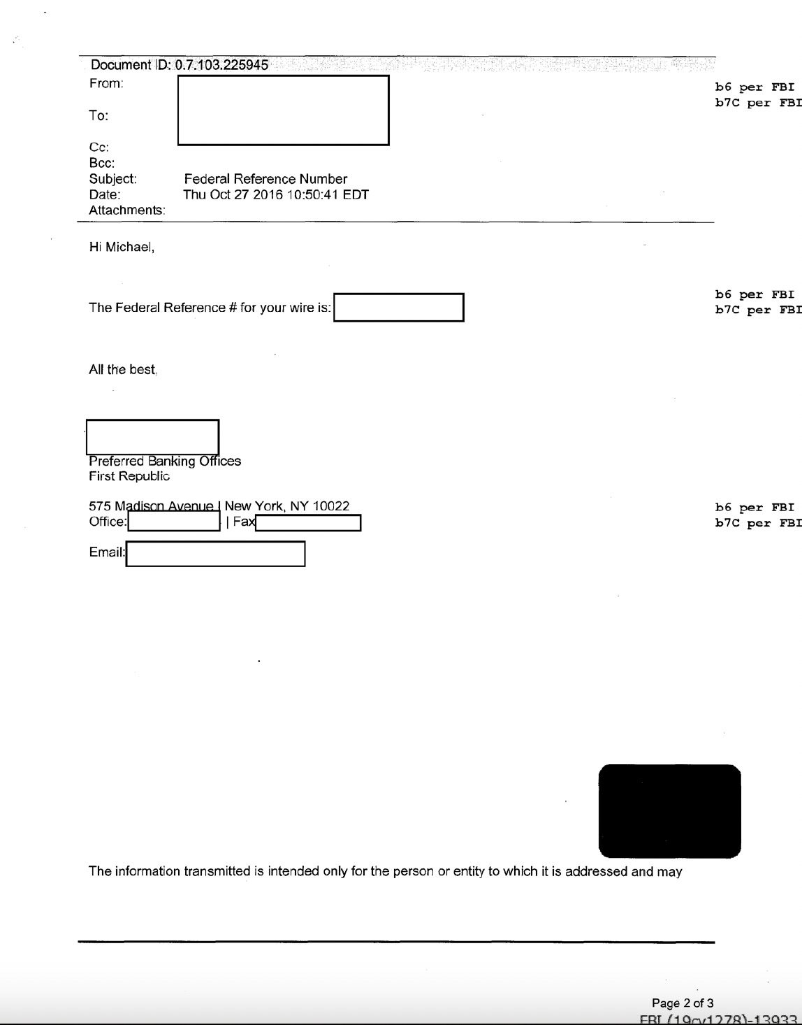 点击这里查看文件(第16页)](https://assets.bwbx.io/documents/users/iqjWHBFdfxIU/rZj84auXD3bU/v0)在电汇发送后不久,科恩收到了来自第一共和国银行的一位人士的确认邮件,可能是当时负责管理Essential Consultants账户的银行董事总经理法罗。根据上周对审判的报道,陪审员们看到了一系列关于Essential Consultants账户和电汇的电子邮件。