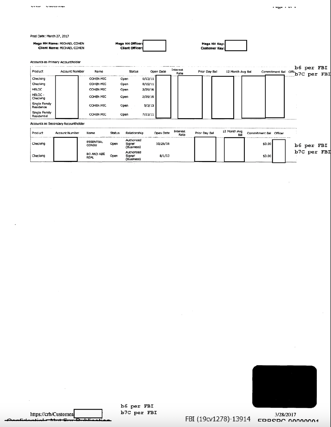 第一份文件识别了科恩作为主要账户持有者的各种账户:支票账户、房屋净值信用额度(HELOC)以及几处房产。HELOC值得注意,因为科恩表示他用它来资助Essential Consultants。