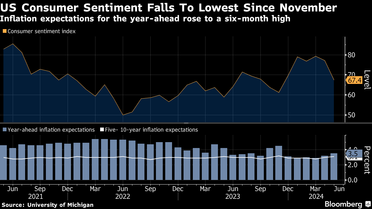 消费者信心在五月初降至六个月来的最低点,原因是对顽固通货膨胀和就业市场的担忧。