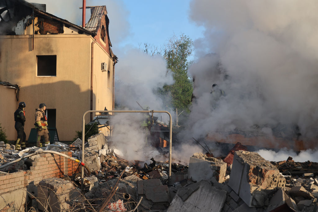 救援人员在哈尔科夫的一处房屋内工作,经过俄罗斯导弹袭击,时间是5月10日的夜间。