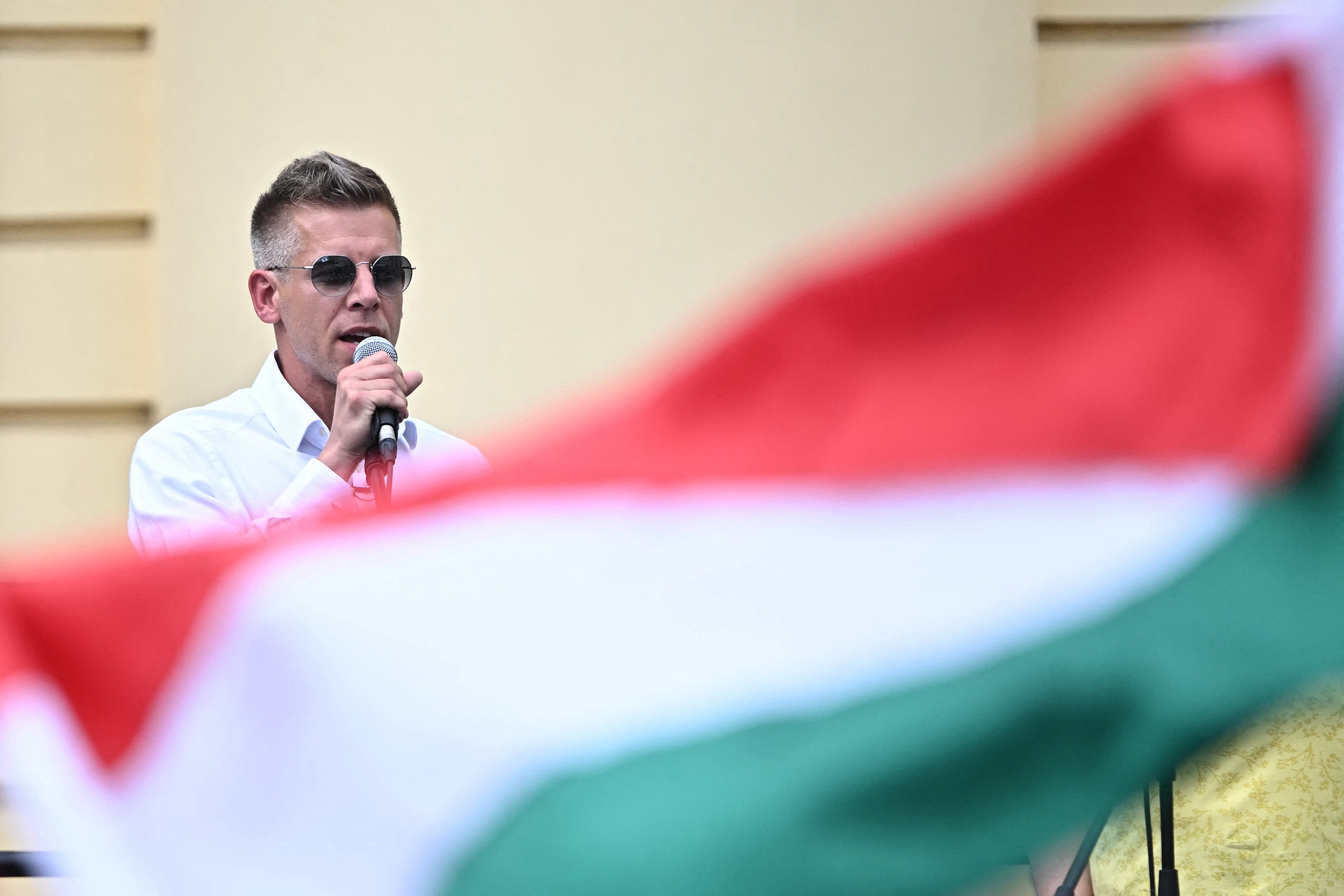 彼得·马加尔在匈牙利德布勒森的欧盟选举运动集会上,时间是5月5日。摄影师:阿蒂拉·基斯贝内德克/盖蒂图片社