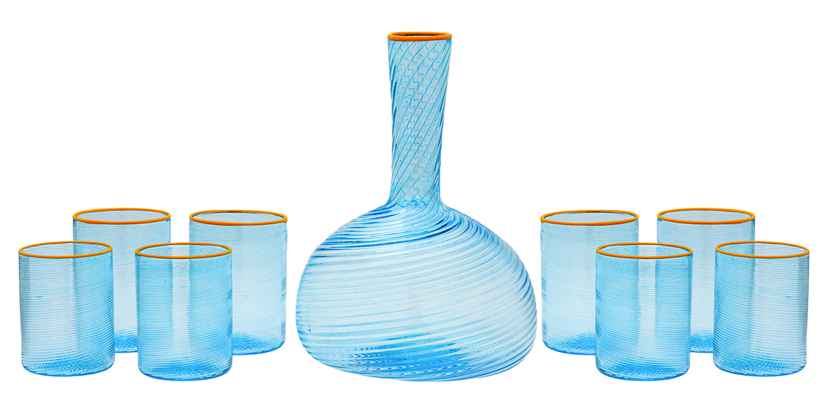 在威尼斯时……来源:Rdb.prconsulting**色彩斑斓的奢华玻璃器皿。**去年秋天,我在吉贝尔托和比安卡·阿里瓦贝内的威尼斯住所,亲眼目睹了吉贝尔托艺术风格的手工吹制穆拉诺玻璃器皿设计。上个月,他在威尼斯的里亚尔托桥开了一家小店——吉贝尔托·威尼斯——在一个小空间里。虽然我喜欢他设计的所有东西,但我现在最喜欢的是这款 气泡蓝水壶和杯子,配有橙色边缘。6个酒杯,€1,080;水壶,€695