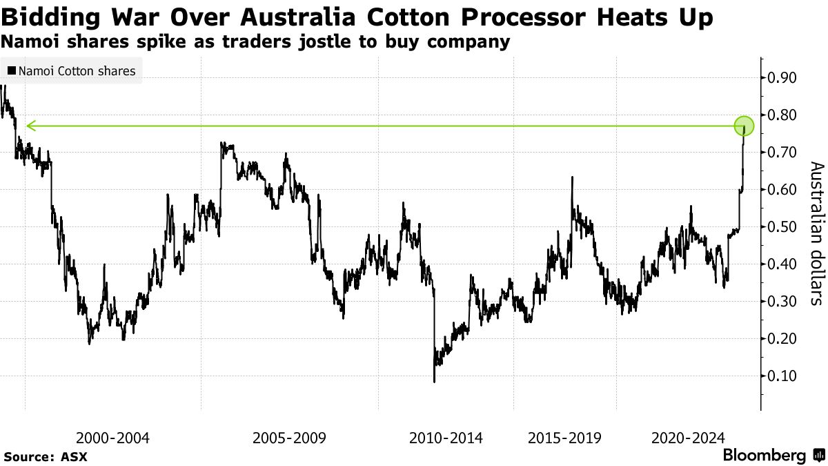 两家主要的农作物交易商正在争夺澳大利亚最大的棉花加工商Namoi Cotton Ltd.。Olam Agri在三月底发起了对该公司的收购,超过了路易斯·德雷福斯的初步报价,几周以来商家们逐步提高了他们的报价。这使得Namoi的股票上周达到了自1999年以来的最高点。澳大利亚是全球最大的纤维出口国之一,最近几年的丰收使其受益匪浅。市场观察者正在关注Olam的最新报价是否会被接受,或者竞标战是否会继续进行。