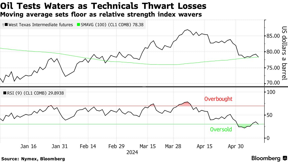 石油的关键技术水平为损失提供了底线。西德克萨斯中质油上周收于每桶78美元以上,此前经历了一个月的下滑,价格跌至自三月中旬以来的最低点。这一稳定主要是因为技术水平提供了支持,而不是更广泛情绪的变化。上周早些时候,100日移动平均线遏制了下跌,而九日相对强弱指数则表明抛售过度。在基本面前景不明的情况下,市场在期待6月1日的OPEC+会议,预计该卡特尔将在下半年继续进行减产以防止过剩。周一石油小幅上涨。