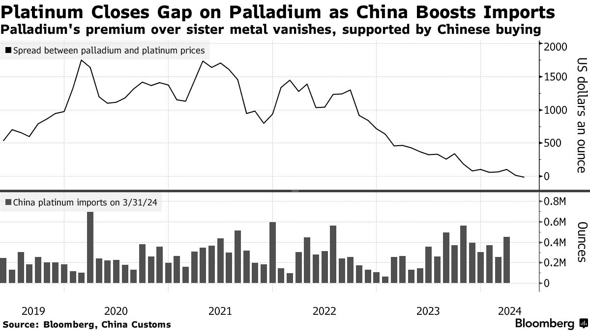 铂金在五月份第二次超过钯金交易,分析师指出由于消费超过供应,面临着即将到来的赤字。这一观点表明,作为汽油动力汽车催化转换器中使用的金属,类似的逆转可能会变得更加频繁。大部分需求似乎来自中国,因为这个亚洲国家正在扩大库存,三月份铂金进口增长了77%。这一趋势可能会成为参加伦敦铂金周活动的人的热门话题,该活动将于周二开始。周一铂金现货价格上涨,而钯金则有所波动。