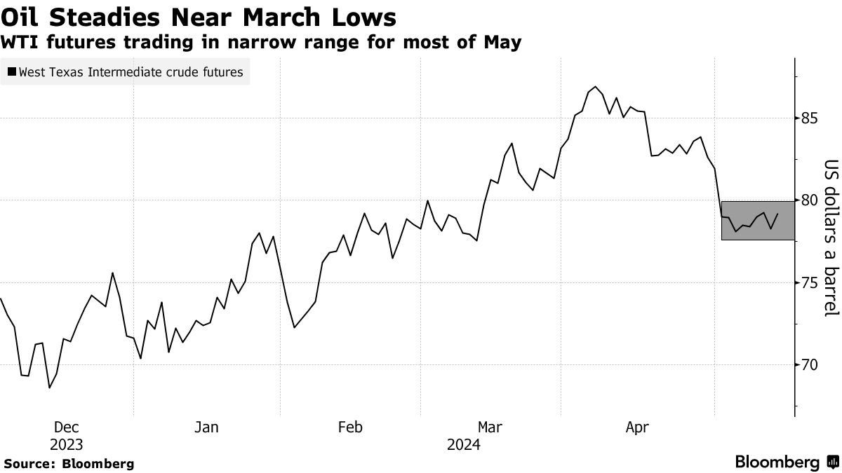 西德克萨斯中质油的结算价超过79美元一桶,此前一天内价格在自5月2日以来的约3美元区间内波动。尽管今年仍然上涨,但原油在4月中旬开始出现下行趋势,因中东地区紧张局势缓解的迹象。说明情绪减弱,上周资金经理减少了他们在布伦特和WTI上的综合净多头头寸,这是五个月以来的最大降幅。