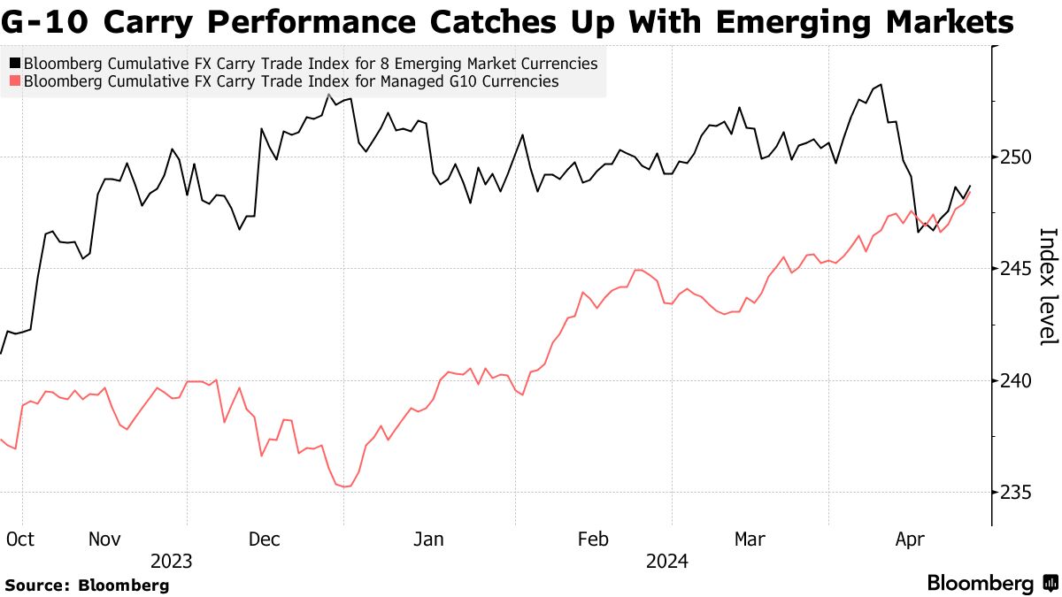 套利交易也是吸引力的一部分。G-10指数旨在衡量在低收益货币中借款并投资于高收益货币的回报,自一月以来上涨了5.8%。相比之下,跟踪八个新兴市场的套利交易指数则停滞不前。去年回报率高达7%的基准,今年下降了0.1%。