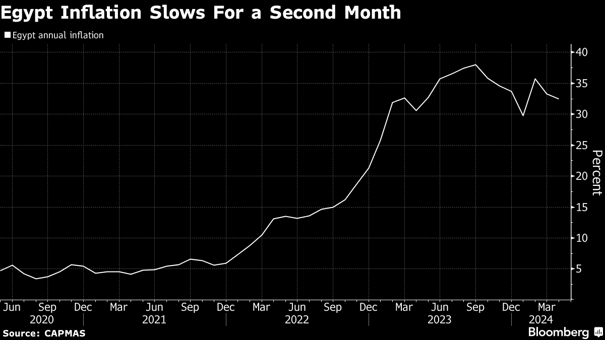 **更多缓解:**埃及的通货膨胀在四月份放缓至32.5%,由于最近货币浮动后外汇的更大可用性似乎缓解了一些价格压力。