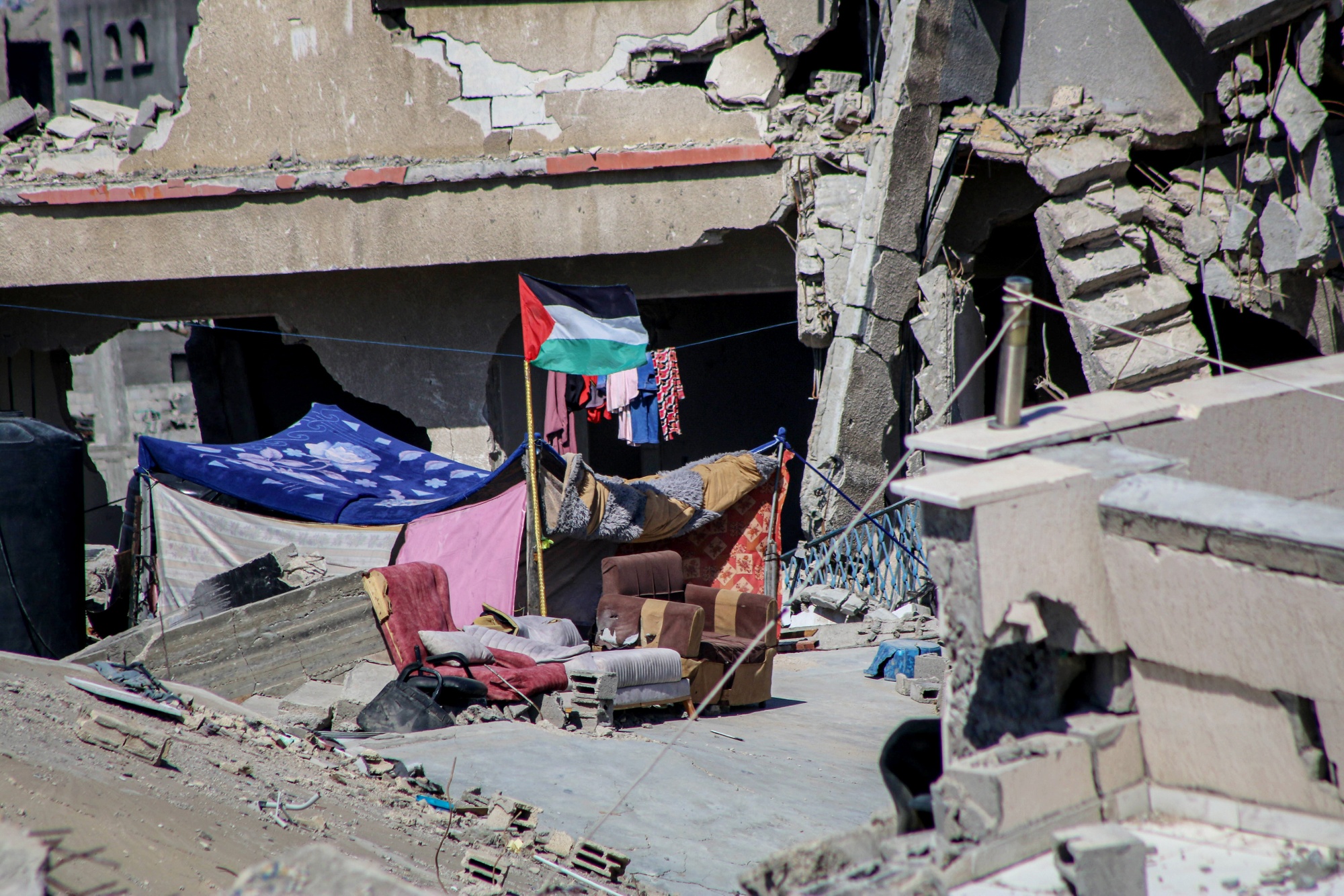 5月8日,在哈恩尤尼斯中心被毁房屋的废墟中搭建的临时避难所。摄影师:阿赫迈德·萨利姆/彭博社巴勒斯坦人和援助组织表示,在如此多的破坏之后,加沙没有安全的地方——而海岸飞地阿尔-毛阿西的设施不足以容纳更多的数十万人。