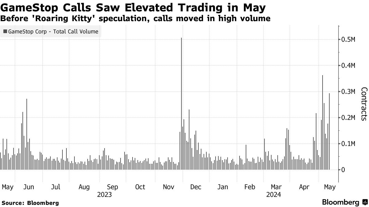 在整个5月,Gamestop在Reddit的WallStreetBets和StockTwits等在线论坛上的提及伴随着其交易量和期权活动的激增。在截至5月10日的一周内,约有1.6亿股易手,这是自2022年4月因股票拆分计划和短暂的迷因股复兴以来,视频游戏零售商股票最活跃的一周。