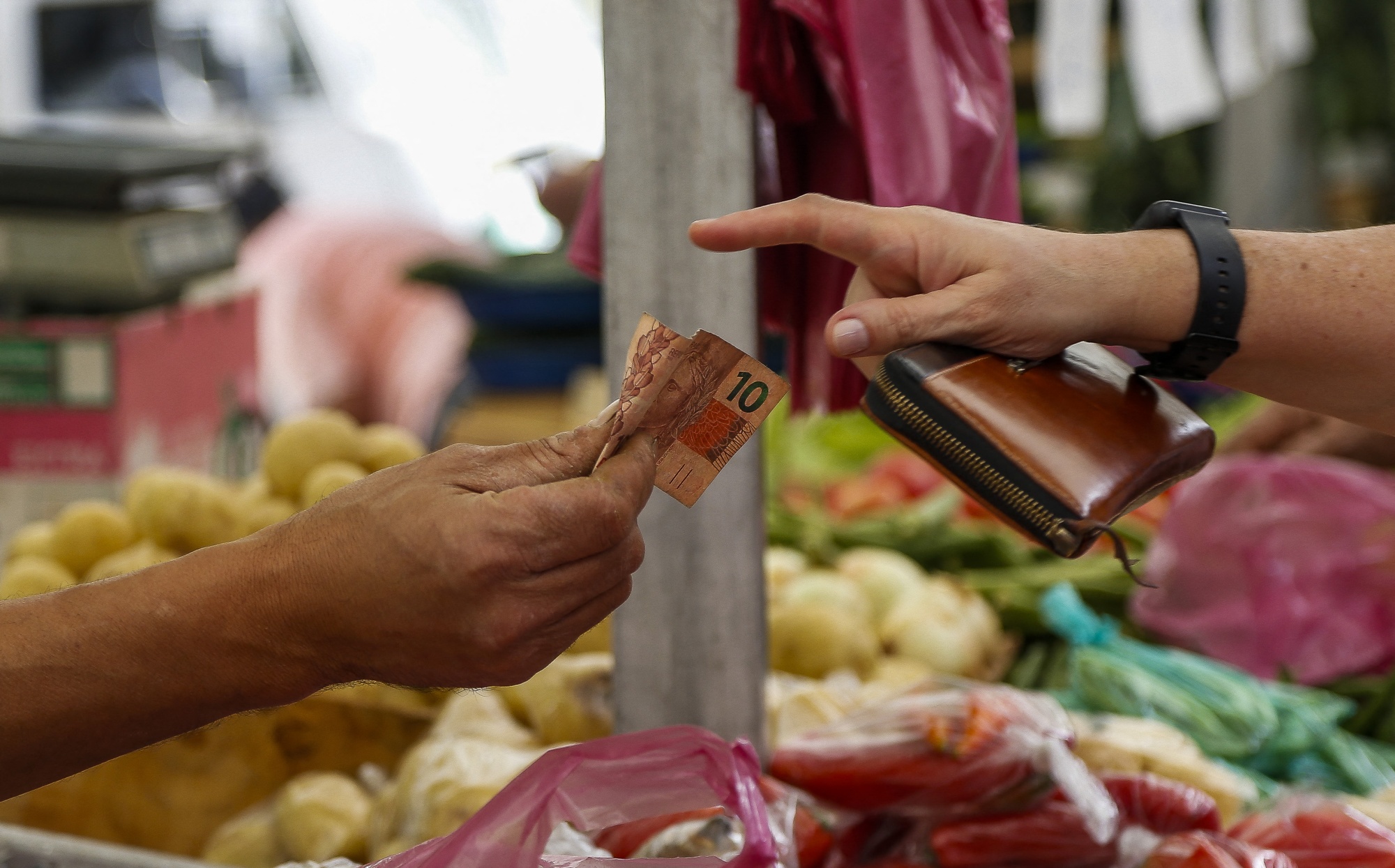一位顾客在巴西圣保罗的街市蔬菜摊位用现金付款摄影师:米格尔·申卡里奥尔/法新社/盖蒂图片社