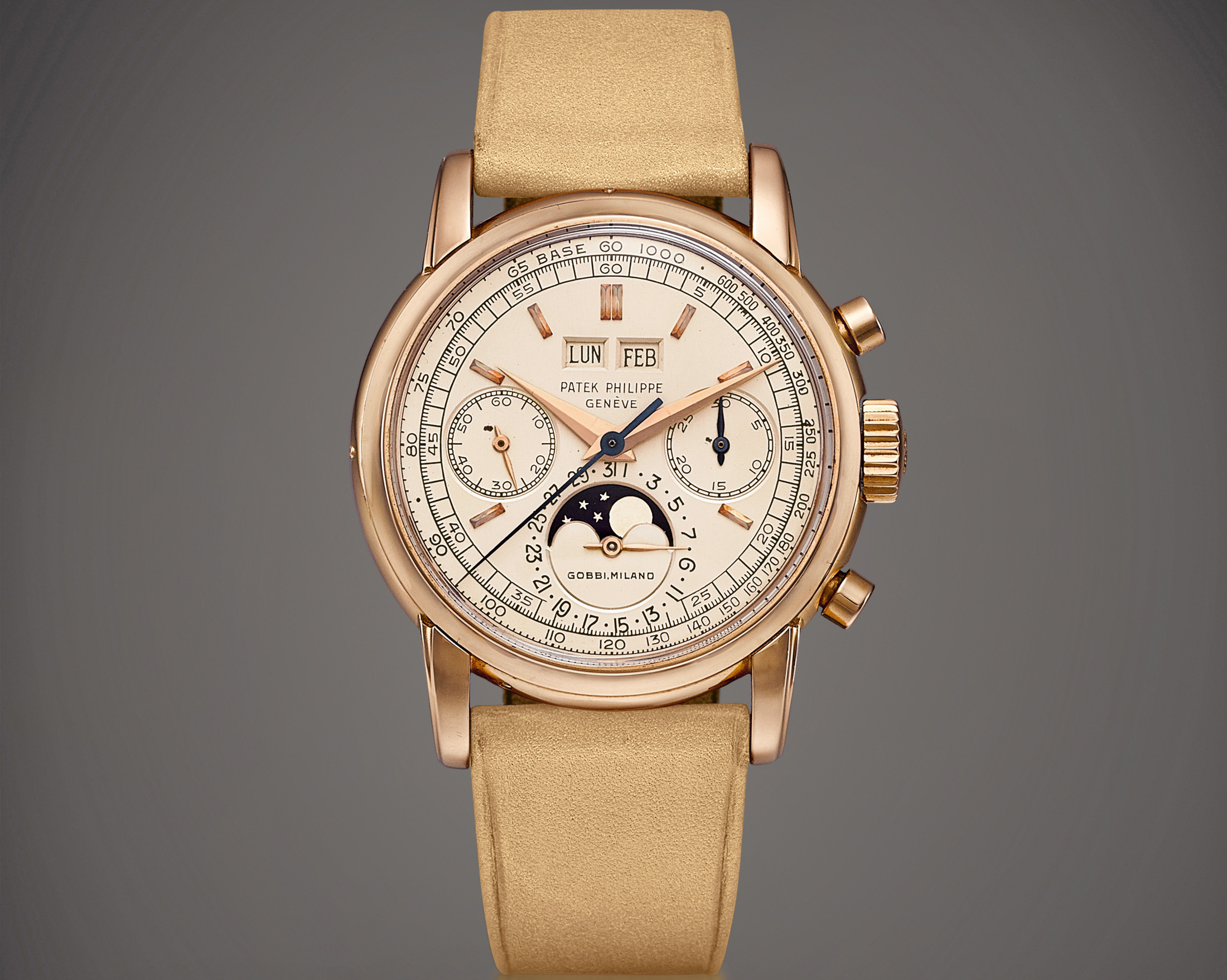 百达翡丽 Ref. 2499。来源:苏富比这款1957年的18K粉红金万年历计时表因表盘上印有意大利零售商Gobbi Milano的标志而显得稀有。它在香港以单一收藏家“内华达人”拥有的40只手表之一的身份出售。