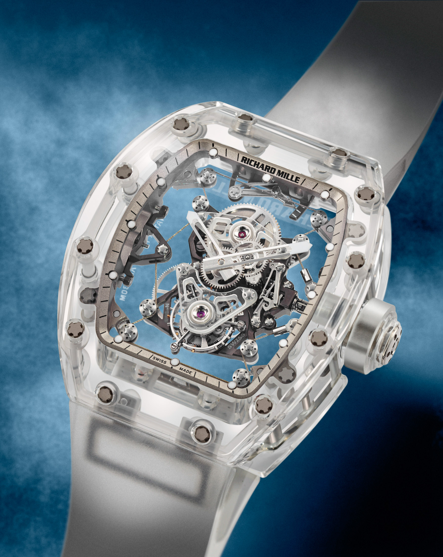理查德·米勒限量版RM56-02 AO陀飞轮蓝宝石。如果你看看机芯的边缘,你可以看到悬挂它的钛丝。来源:佳士得理查德·米勒可能最为人知的是一种让富人知道他们富有的手表。这个法国品牌每年生产约5300件,平均售价为25万美元。