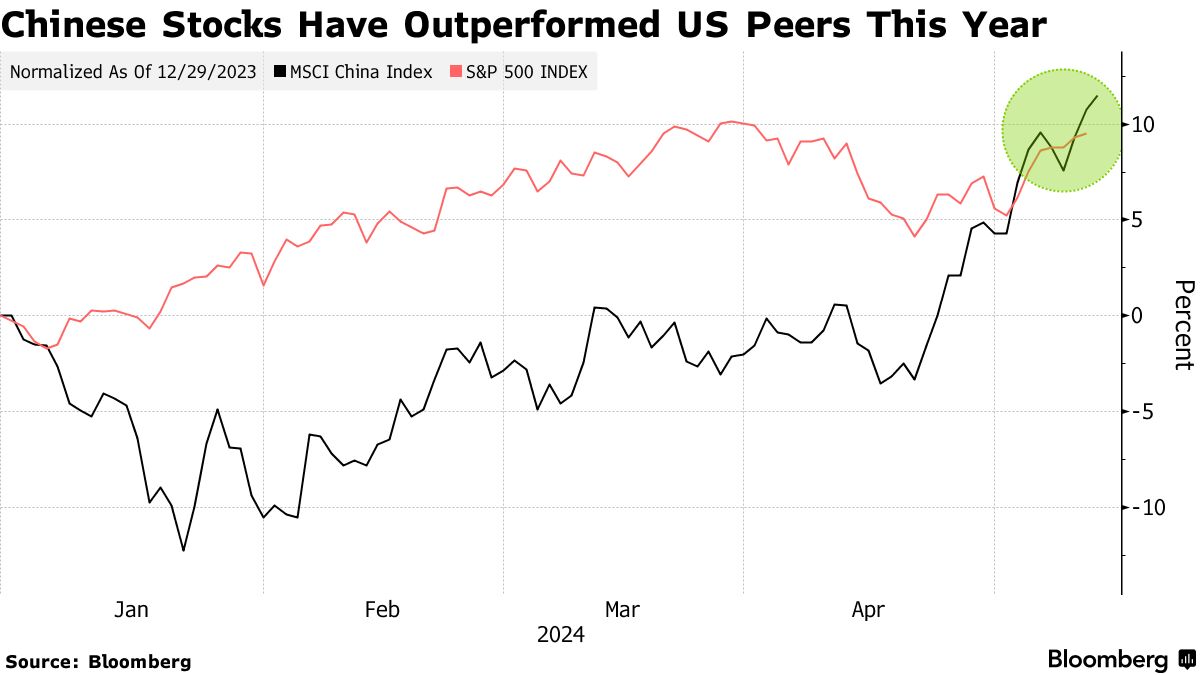 来自美国、日本和印度等市场的轮换,股票已飙升至高点或接近纪录,与中国的低估值相比,成为了一个催化剂。海外投资者在四月份通过与香港的交易链接连续第三个月购买了在岸股票,这是一年以来最长的这一趋势。