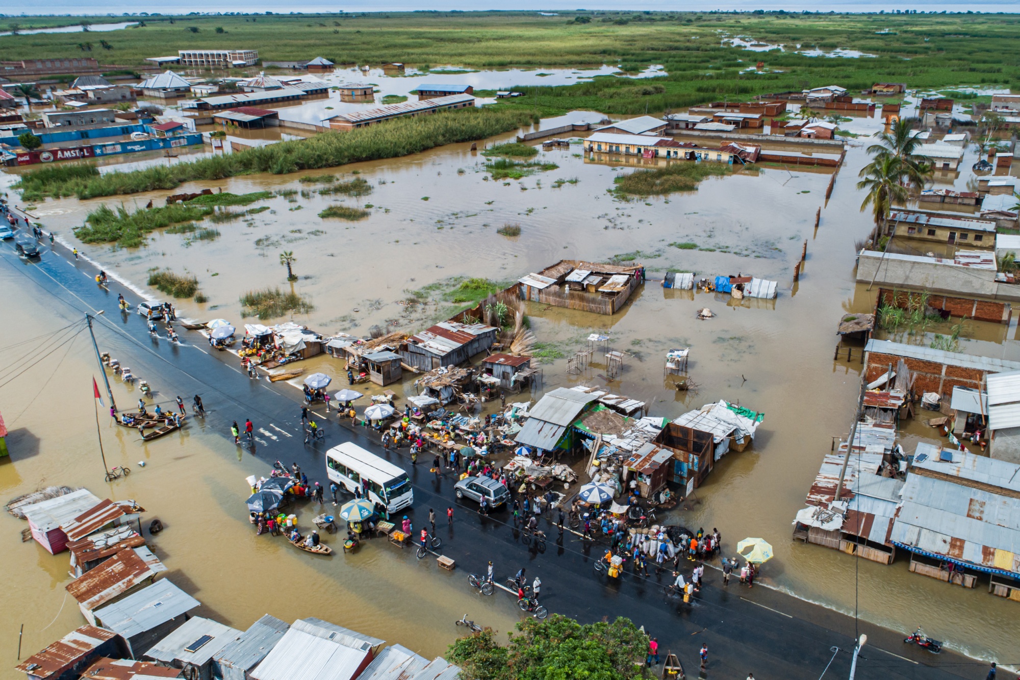 洪水改变了城市的景观:海滩沿线的道路被淹没,无法使用,小船的船主通过带游客参观他们被淹没的房屋来赚取现金。房屋、汽车、企业甚至医院都被持续的洪水淹没,曾经可见的树干现在只有植物的顶部露出水面。在布琼布拉的泥泞道路上看到河马漫游并不罕见,而在邻近的加通巴镇,鳄鱼已侵入街道,当地当局称至少有七人被这些动物杀死。