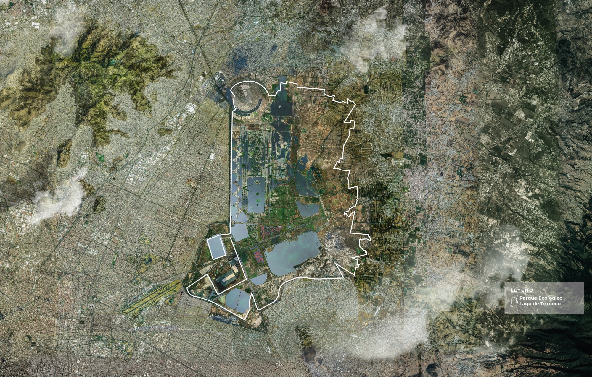 纳博尔·卡里略湖是一个灵感来源。今天的湖岸看起来很自然,但海岸外可见的巨大起重机般的泵暗示了它的起源。这个湖是一个人造的水文调节容器,开发于1970年代的特斯科科干湖床,用于储存城市的径流,形成池塘以限制蒸发造成的损失。从飞往墨西哥城的飞机窗户看,这个“湖”呈现出一个奇怪的矩形;其植被以两种耐盐植物为主,塔玛里克树和斯皮卡塔草,都是非本地引进的植物,带到这里以平息曾经从特斯科科干湖床吹来的沙尘暴,导致全城的呼吸系统疾病。