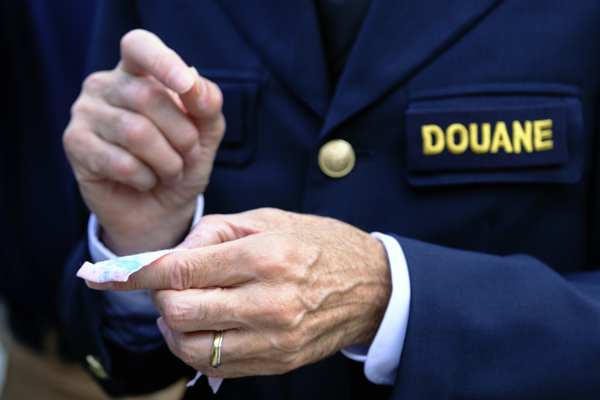 比利时联邦海关服务负责人克里斯蒂安·范德瓦伦展示了在安特卫普港口发现的可卡因反应擦拭布。摄影师:蒂埃里·莫纳斯/盖蒂图片社去年底的一个月里,帮派的胆大妄为显而易见,他们三次试图夺回被安特卫普港口查获的可卡因货物,其中一次携带自动武器,另一次则持有砍刀。