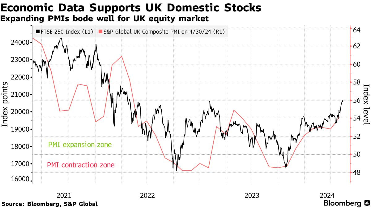 上周的数据表明季度 国内生产总值增长,这是对以国内为重点的股票的好兆头。它补充了采购经理人指数调查的数据显示,英国经济继续扩张。