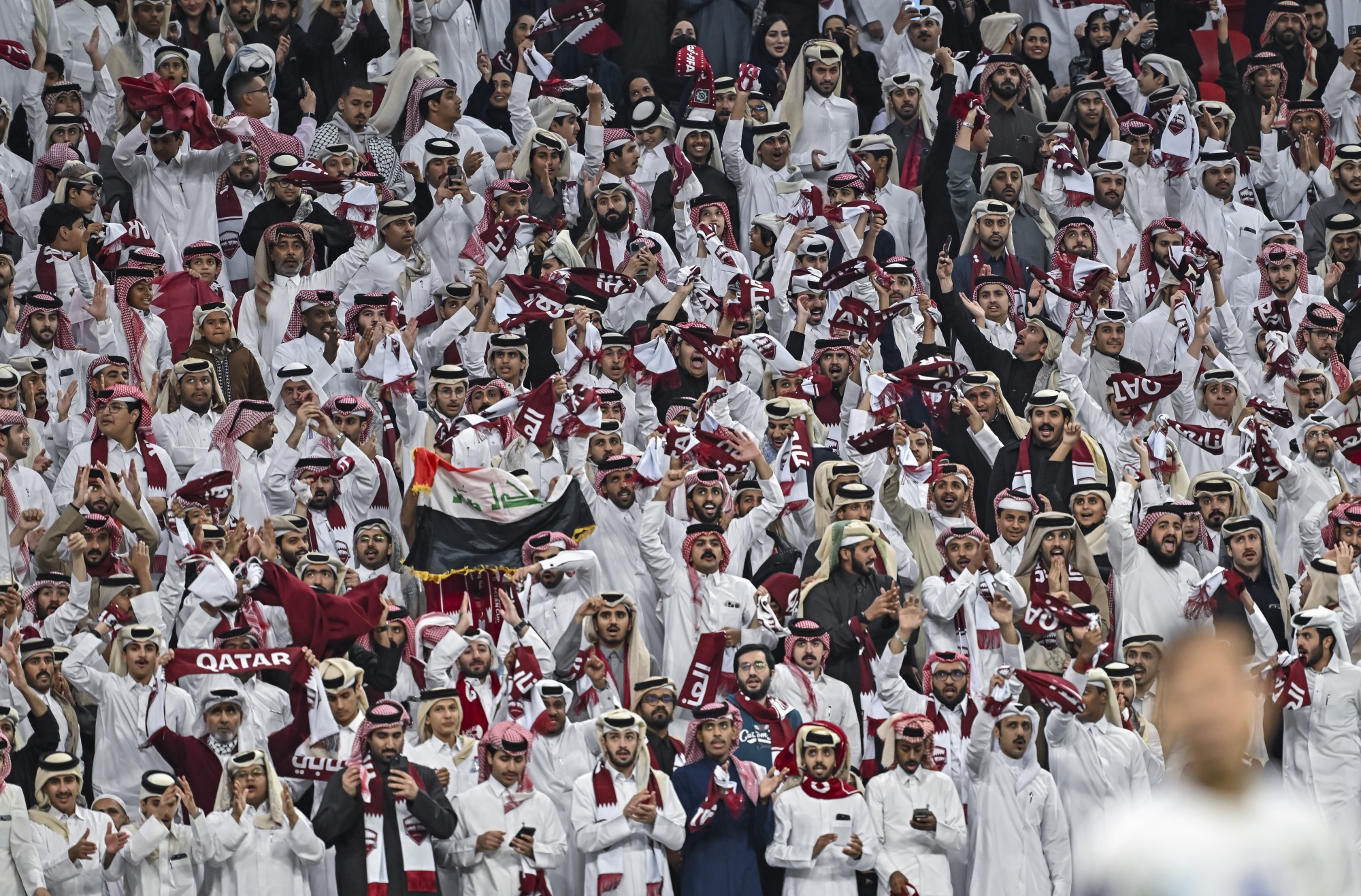 球迷在卡塔尔阿尔霍尔的阿尔贝特体育场观看亚洲杯比赛时欢呼。