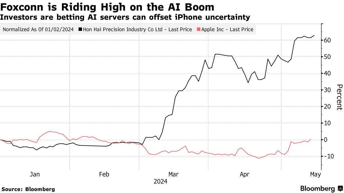 这一失利部分反映了围绕AI的高期望,这帮助鸿海的股价在今年上涨了超过60%。它受益于对AI基础设施(如数据中心)的重大投资。公司高管维持了对今年AI服务器业务40%增长的预期。