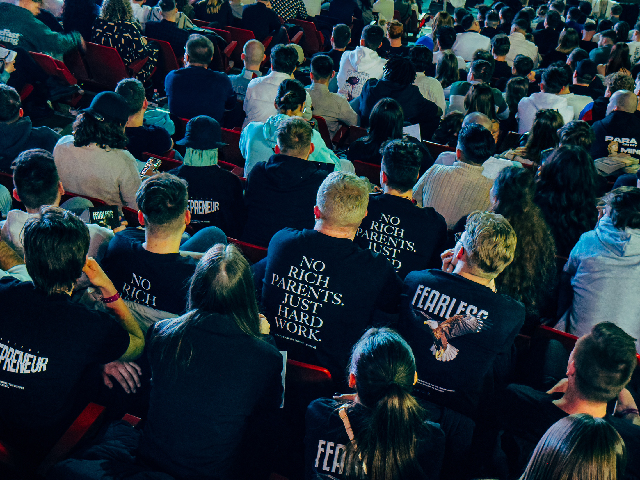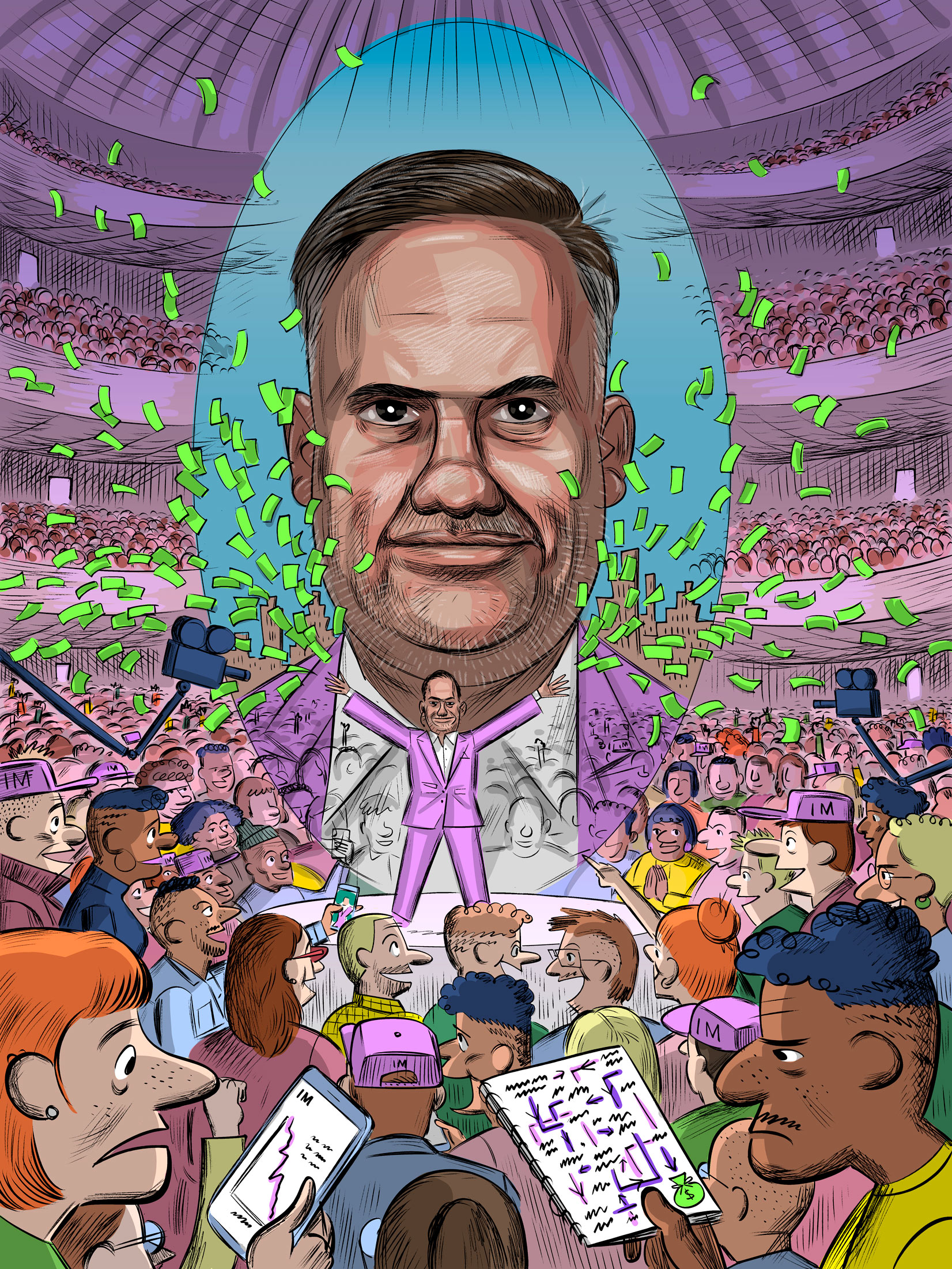 在荷兰的竞技场内,年轻男士们身着最好的商务服装,有的穿着黑色高领毛衣和银链,有的则把太阳镜挂在脑后,耳朵里插着一个AirPod,许多人定期查看手机进行交易。里查兹穿着黑色衣服,头发扎起,脸妆精致,兴奋不已。经过几个月的期待,她终于要见到IM背后的天才。特里穿着红色西装外套和运动鞋走上舞台。人群开始高呼他的名字,迫使他停顿了五分钟,直到他终于向追随者问好:“爸爸来了。你们是我的孩子,好吗?”