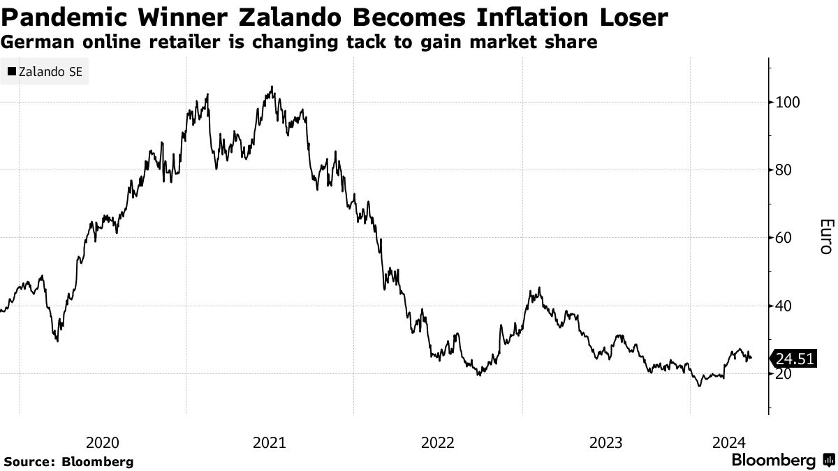 Zalando的股价在疫情期间飙升至创纪录水平,但在2022年和2023年更快的通货膨胀和顾客回归实体店导致销售额下滑。随着公司着手实施新战略以占据更大的电子商务市场份额,股价今年已上涨约15%。