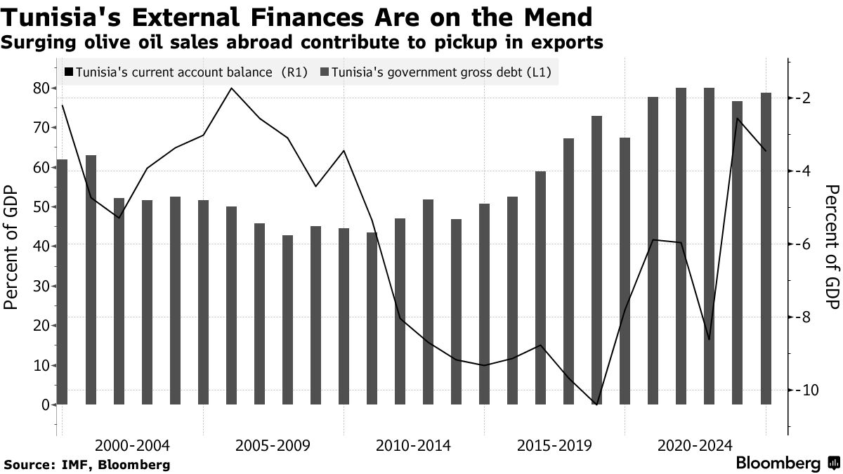 “突尼斯的经济显示出一些韧性,尽管面临持续的挑战,”世界银行突尼斯国家经理亚历山大·阿罗比奥在一份报告中表示。“纺织品、机械和橄榄油的出口增加,加上旅游出口的增长,帮助缓解了外部赤字。”