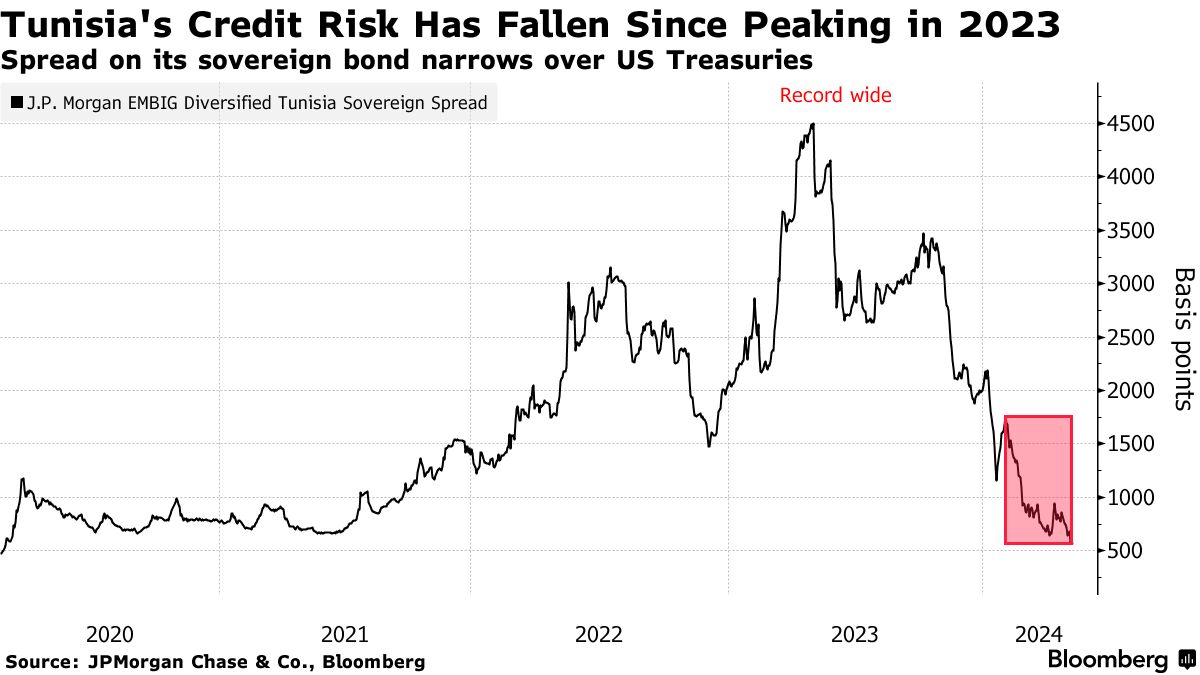 自那时以来,突尼斯债券相对于国债的利差已降至四年多来的最低水平。信用违约掉期,作为国家风险的衡量标准,目前不到2023年3月创纪录水平的一半。