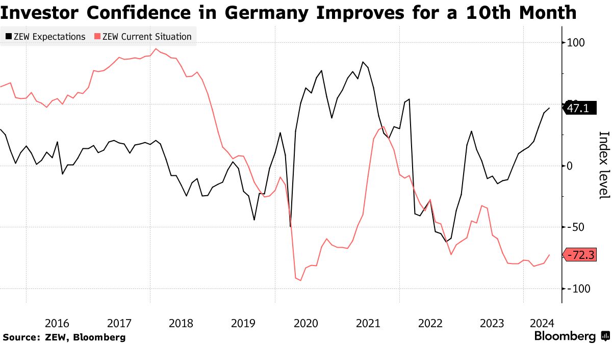 “经济复苏的迹象正在增加,得益于对整体欧元区和中国这一关键出口市场的更好评估,”ZEW主席阿希姆·万巴赫在一份声明中表示。“这种乐观情绪特别体现在对国内消费预期的急剧上升,其次是建筑和机械行业。”