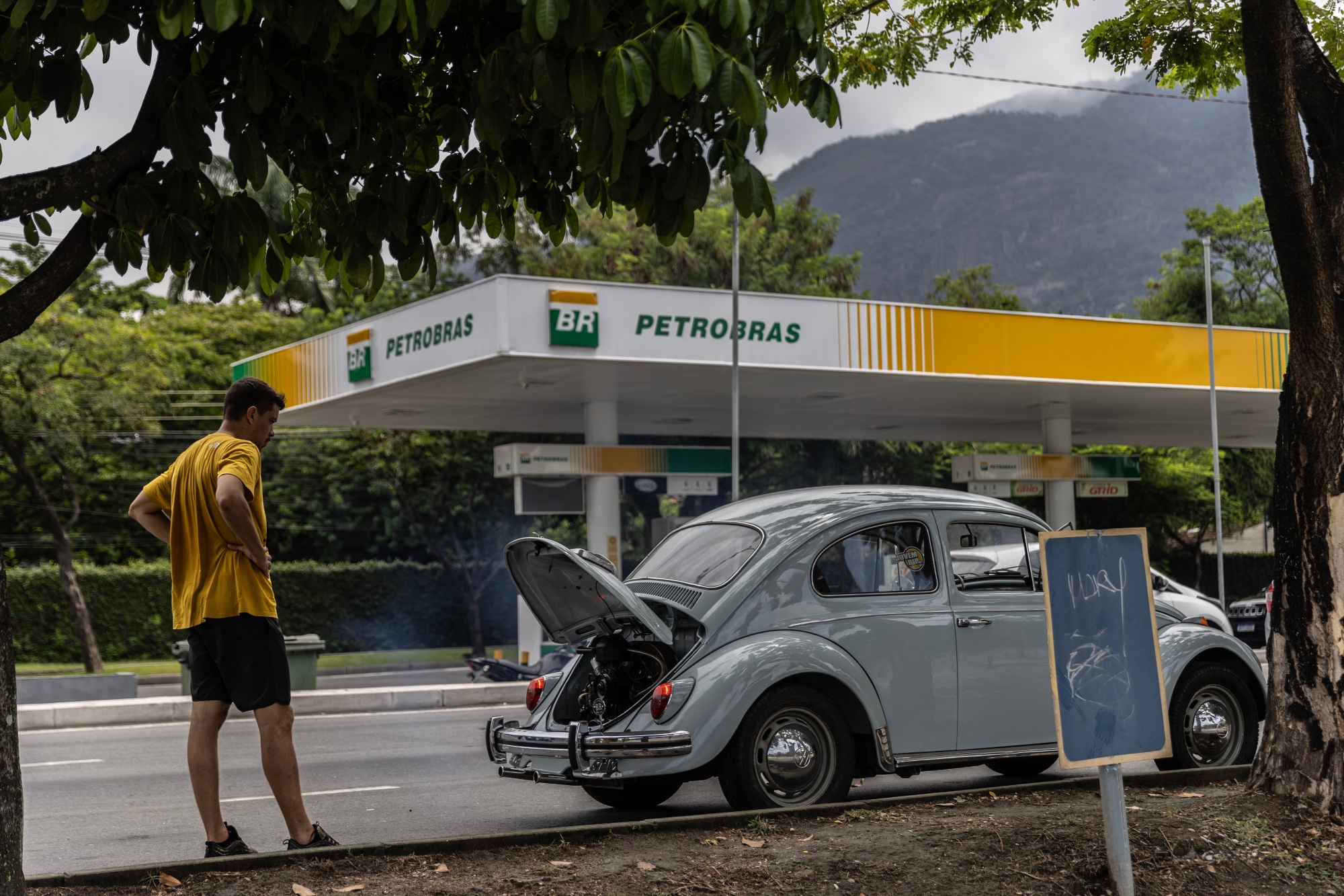 一名司机在2024年3月6日星期三在巴西里约热内卢的一家Petrobras加油站前检查他们的车辆。摄影师:Dado Galdieri/Bloomberg