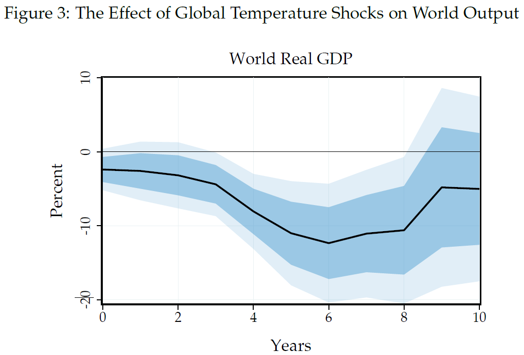 之前的计算确定,1摄氏度的温度冲击将在中期内使全球GDP最多减少1%到3%。但这些研究并没有充分考虑更高平均温度的动态影响。哈佛大学的Adrien Bilal和西北大学的Diego Känzig现在得出结论,实际上会导致12%的GDP冲击。