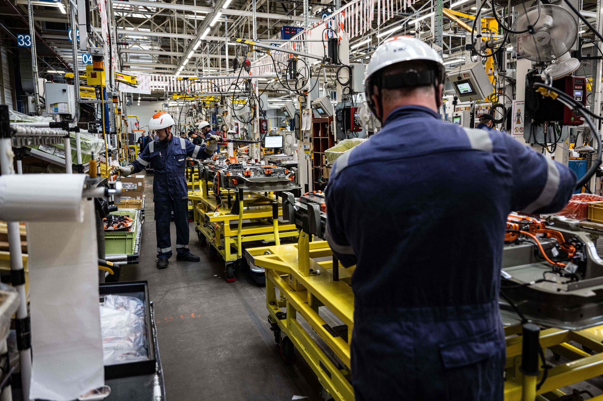 操作员在斯特兰蒂斯汽车工厂的电池车间工作。