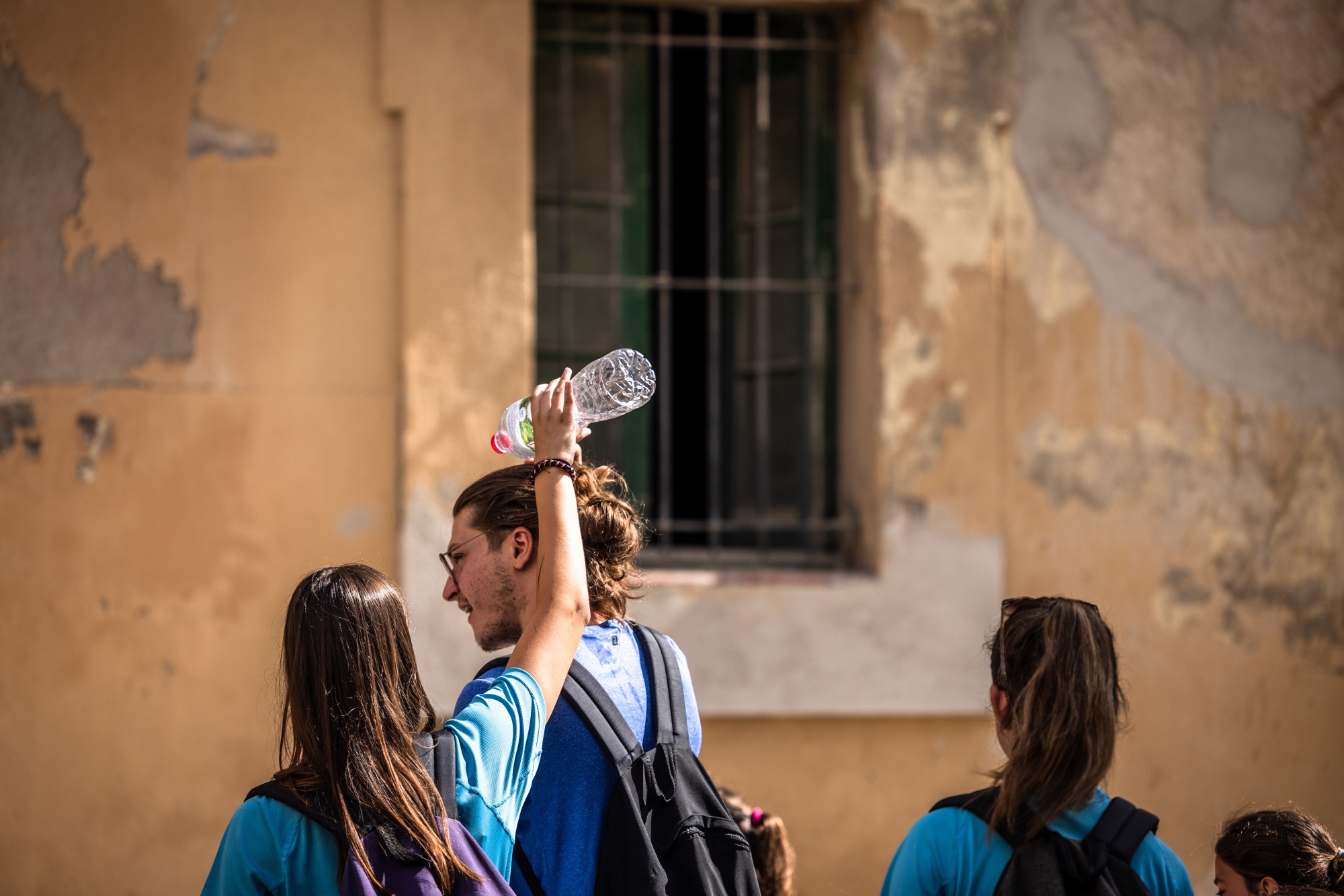 一个人在西班牙吉罗纳的拉比斯巴尔德(La Bisbal d’Empord)倒水在朋友头上降温,时间是2023年7月19日。