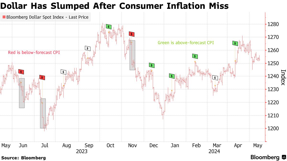 美元 在较冷的通胀数据公布后有下跌的历史。在过去一年中,已经有三次低于预期的通胀数据未能达到预期。在每种情况下,美元在交易周结束时都明显下跌。