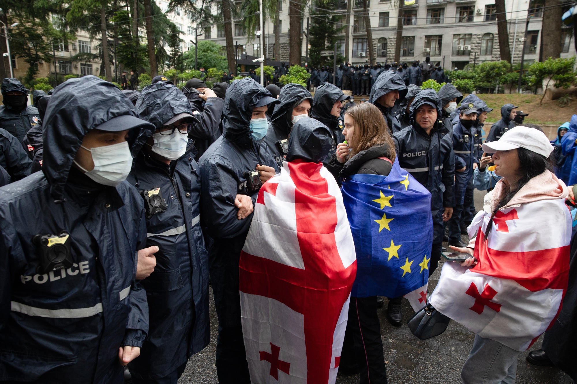 警察在格鲁吉亚首都第比利斯的议会附近阻止反对派集会抗议外国代理法案,时间为5月14日。摄影师:安德烈·鲁达科夫/彭博社尽管成千上万人在议会外抗议,格鲁吉亚议员们还是通过了一项所谓的反外国影响法案,西方盟友称这类似于俄罗斯用来镇压异议的法律。