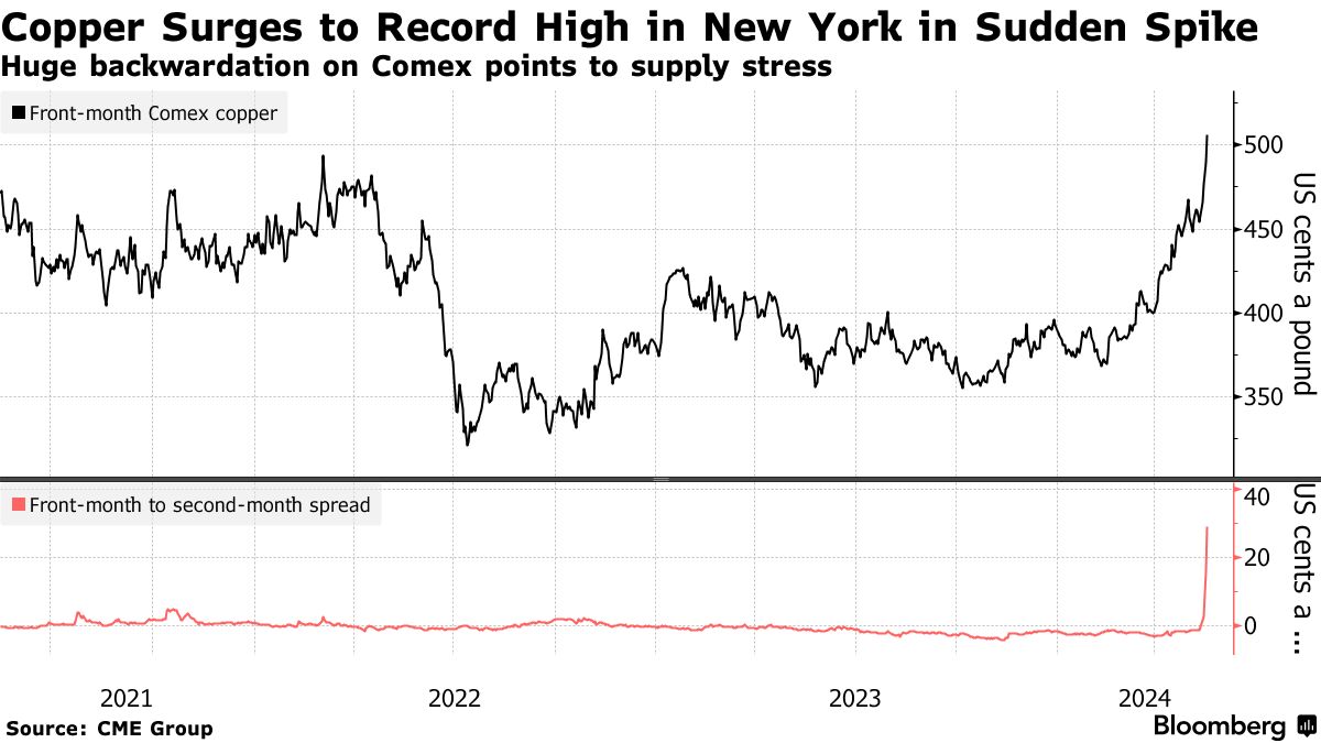 这一突然的激增——本周Comex期货上涨超过7%——导致7月交割的金属在纽约交易所的价格创下了历史高位,与其他全球大宗商品交易所上的铜相比,价格也达到了前所未有的高水平。