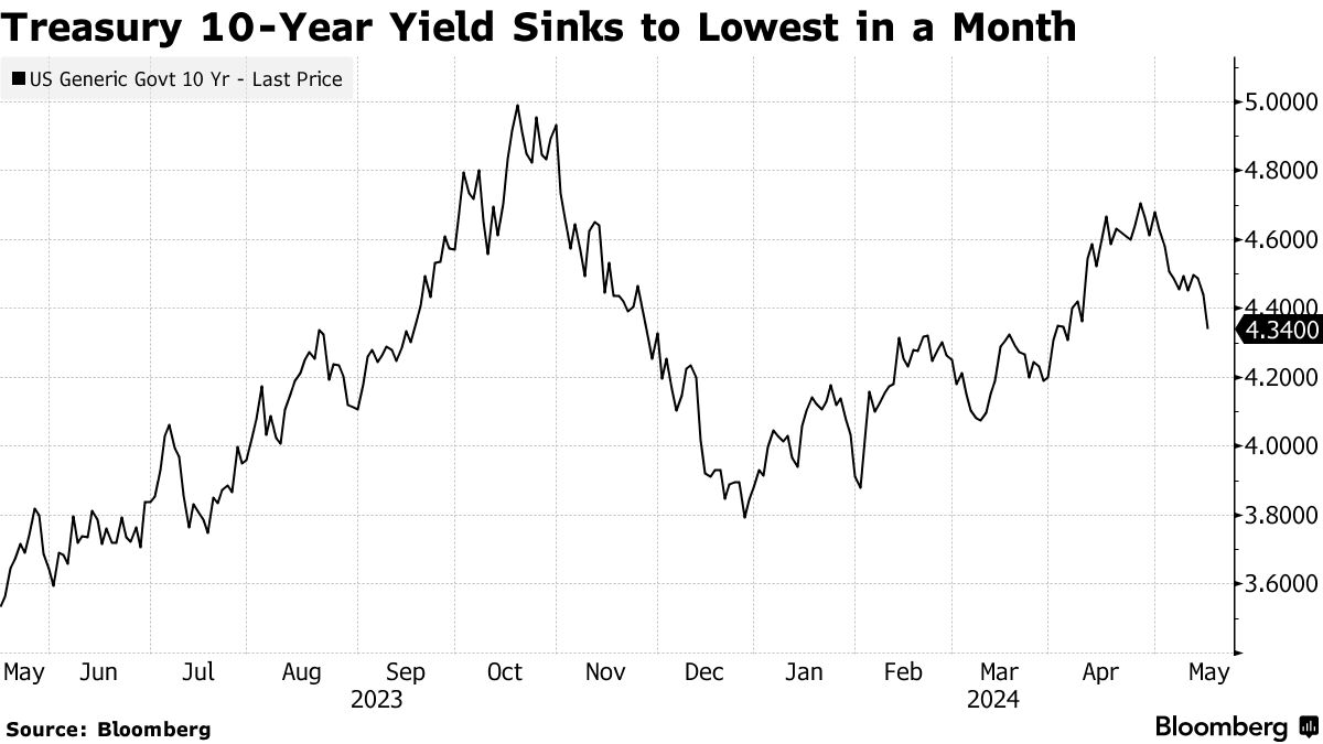 国库10年期收益率下降了10个基点至4.34%。最新数据帮助这些债券在本月逆转了四月份超过一半的抛售。 彭博美元现货指数 创下一个月来的新低。