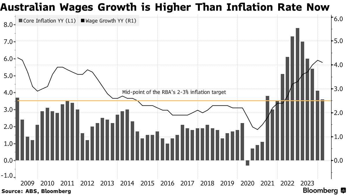 澳大利亚储备银行官员此前表示,如果经济的生产力表现得到改善,约4%的工资增长符合中央银行的2-3%通胀目标。然而,决策者们意识到,长时间的高通胀可能会引发更大的薪资要求,并促使企业进一步提高价格,使将CPI恢复到目标水平变得更加困难。