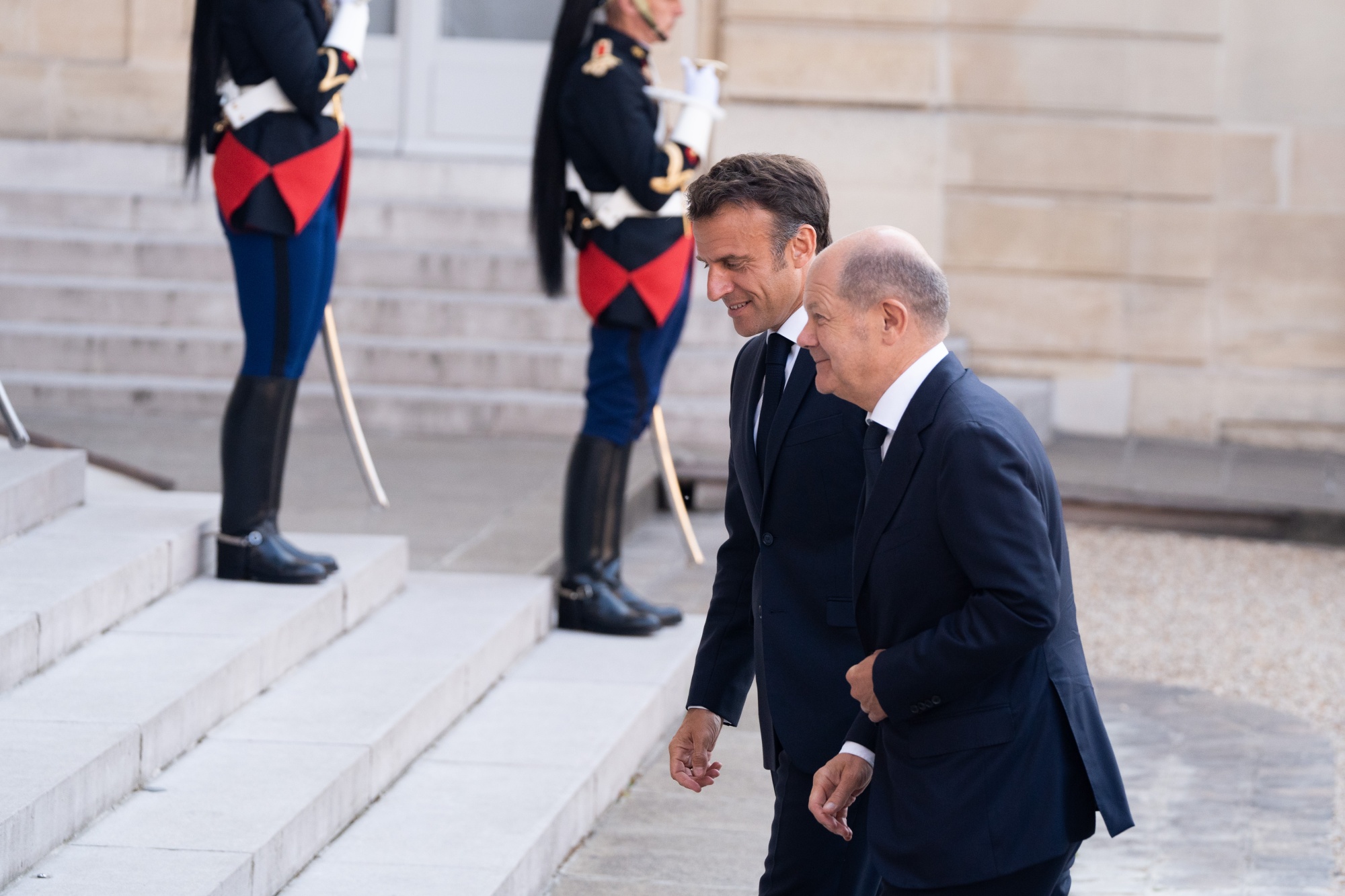 法国总统埃马纽埃尔·马克龙(Emmanuel Macron)左,去年六月在巴黎爱丽舍宫接待德国总理奥拉夫·肖尔茨(Olaf Scholz)。