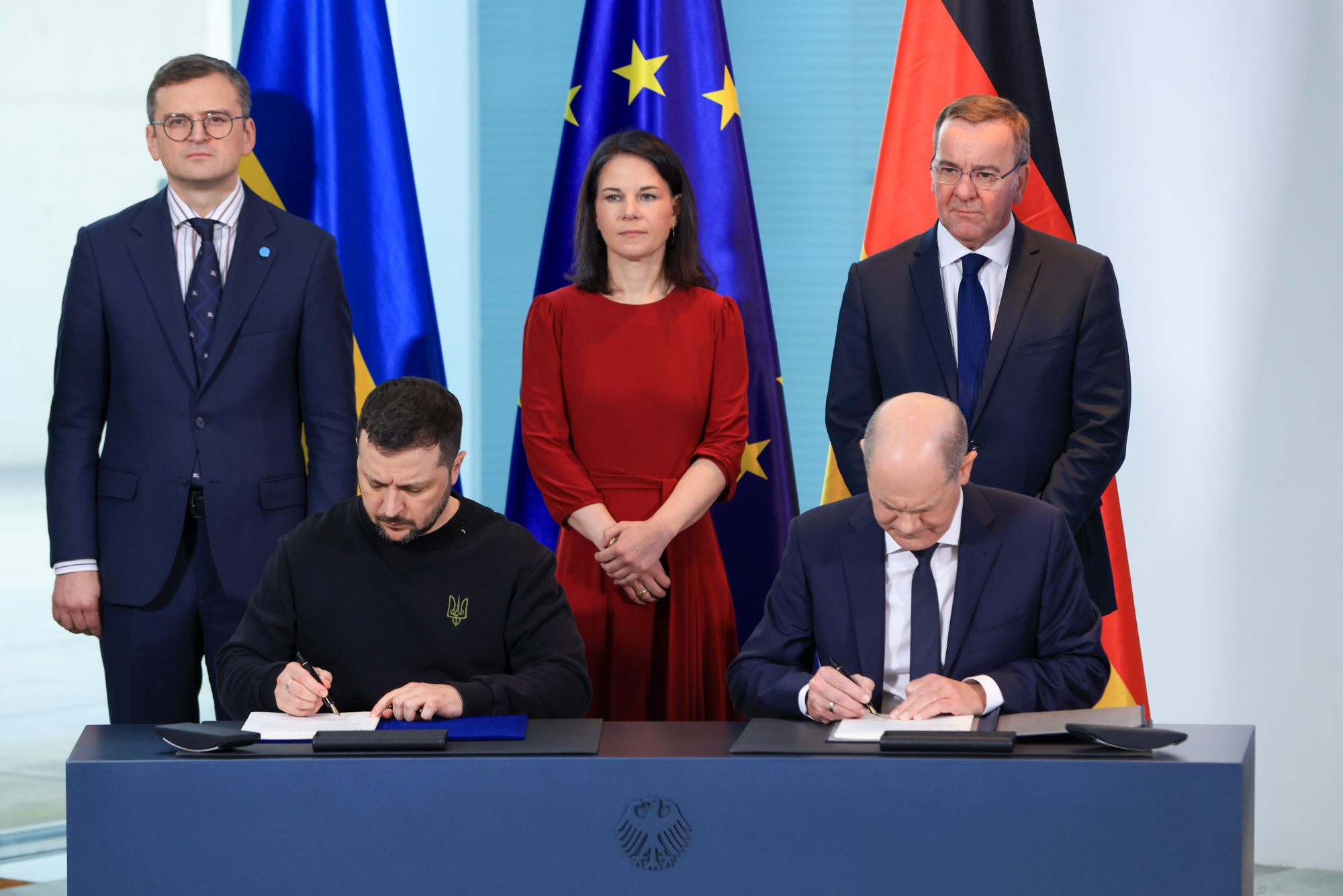 Scholz,右,与乌克兰总统泽连斯基在柏林签署双边安全合作协议,日期为2月16日。摄影师:Krisztian Bocsi/BloombergScholz迄今为止是唯一一位提供更多防空系统的领导人,甚至冒着暴露德国的风险承诺提供第三套爱国者系统。“不幸的是,仍然没有足够的追随者,”一位恼怒的Scholz本周告诉Stern杂志,描述缺乏承诺为“令人沮丧”。