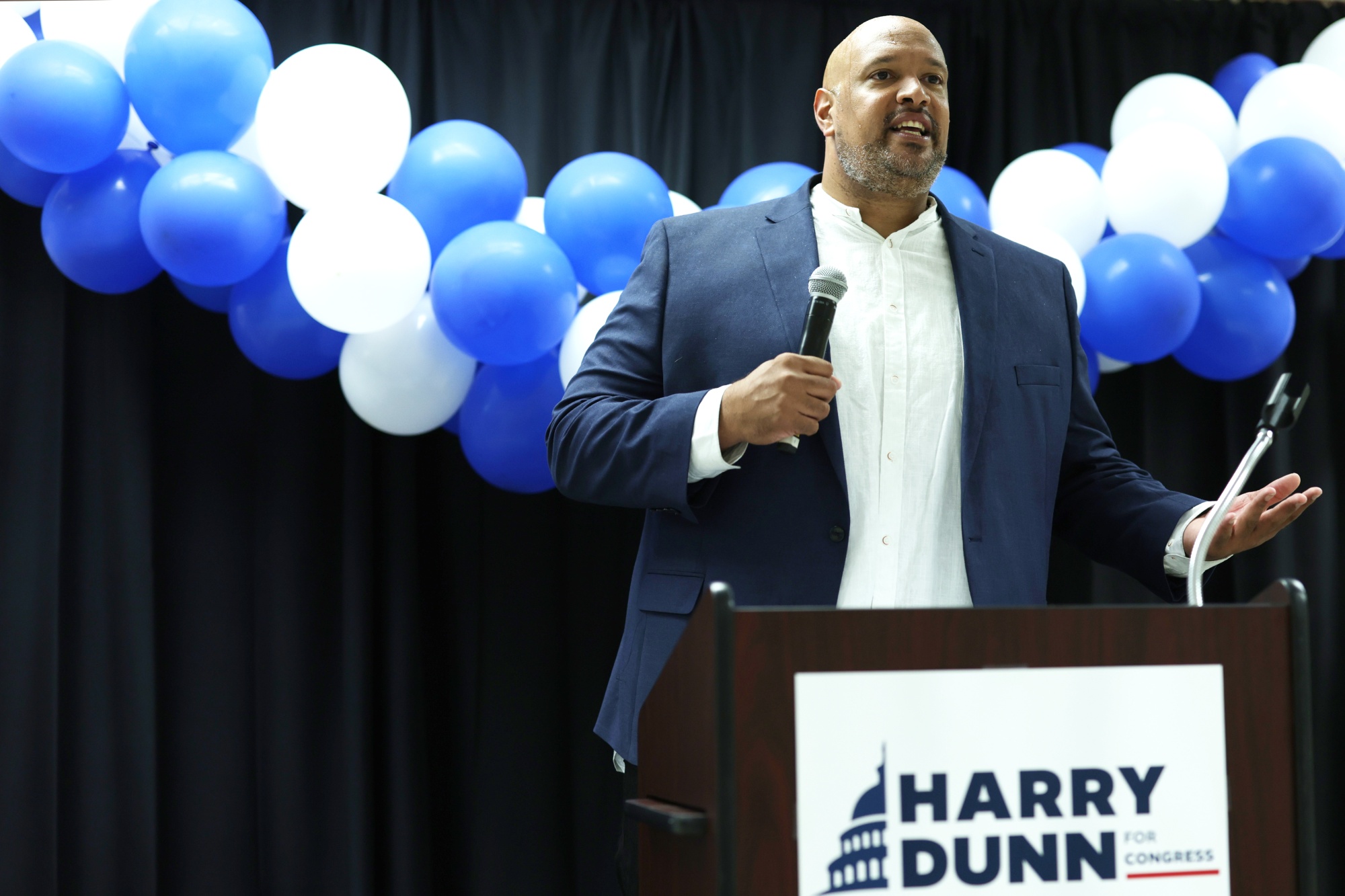 哈里·邓恩在马里兰州埃利科特城的初选晚会上与支持者交谈,时间是5月14日。