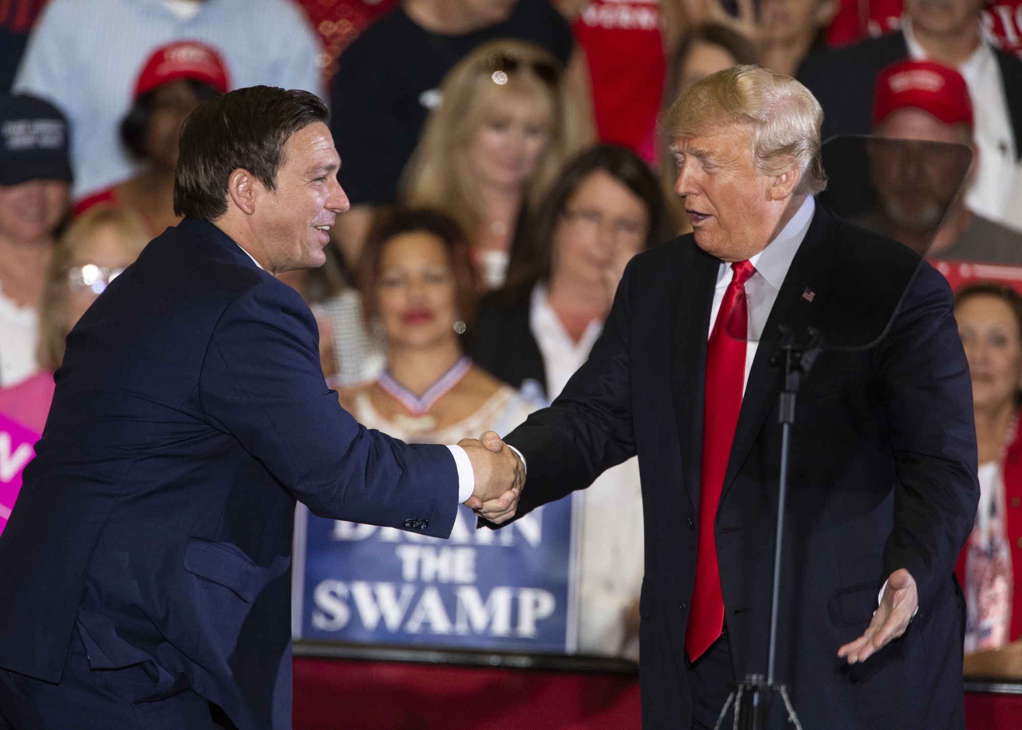 唐纳德·特朗普和罗恩·德桑蒂斯摄影师:马克·沃尔海泽/盖蒂图片社特朗普竞选团队未回应要求就筹款活动发表评论的请求。