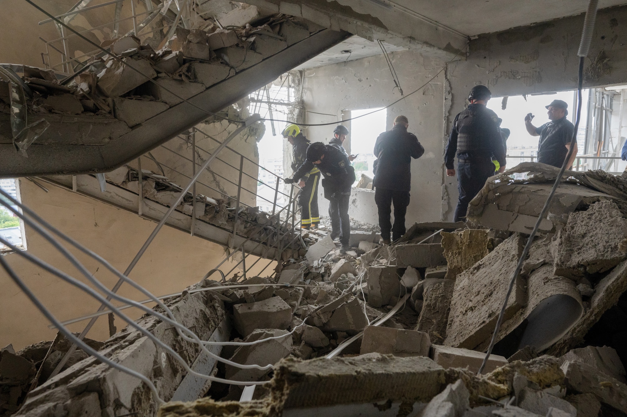 乌克兰国家紧急服务部队的救援人员在5月14日俄罗斯导弹袭击后检查哈尔科夫的损坏情况。