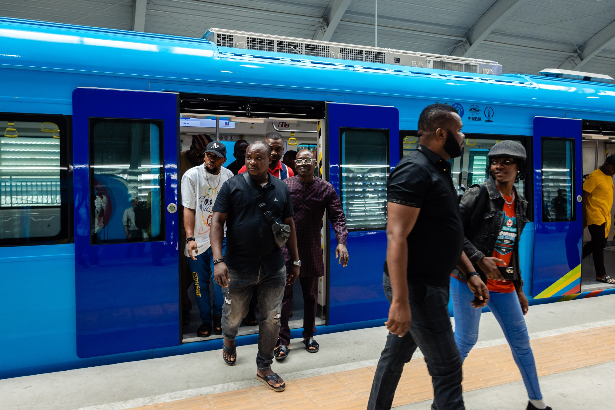 乘客从尼日利亚拉各斯铁路轨道交通地铁列车在拉各斯的码头站下车